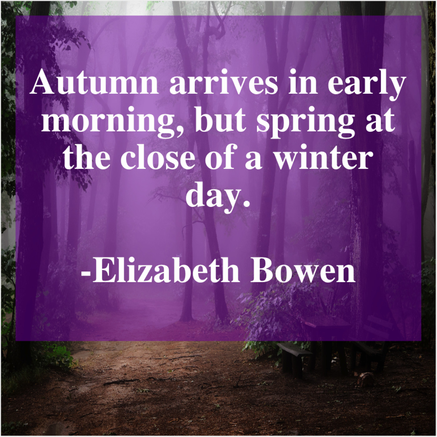 Elizabeth Bowen Elizabeth Bowen – Autumn arrives in early morning… June 25, 2019 admin “Autumn arrives in early morning, but spring at the close of a winter day.”-Elizabeth Bowen