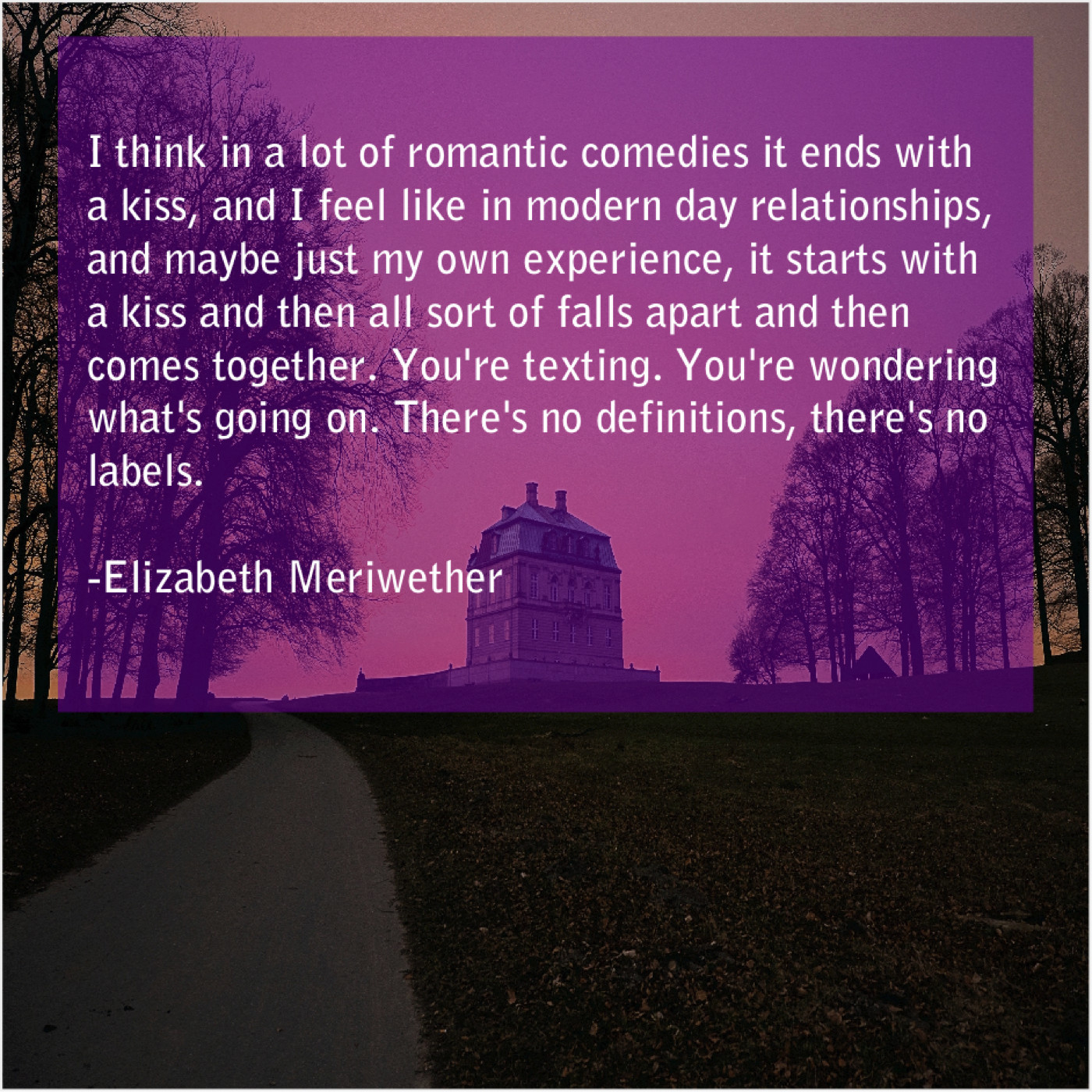 “I think in a lot of romantic comedies it ends with a kiss, and I feel like in modern day relationships, and maybe just my own experience, it starts with a kiss and then all sort of falls apart and then comes together. You’re texting. You’re wondering what’s going on. There’s no definitions, there’s no labels.”