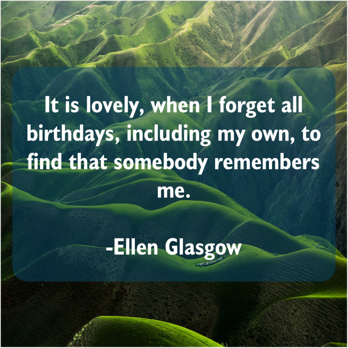 Ellen Glasgow Ellen Glasgow – It is lovely, when I… July 31, 2019 admin “It is lovely, when I forget all birthdays, including my own, to find that somebody remembers me.”-Ellen Glasgow