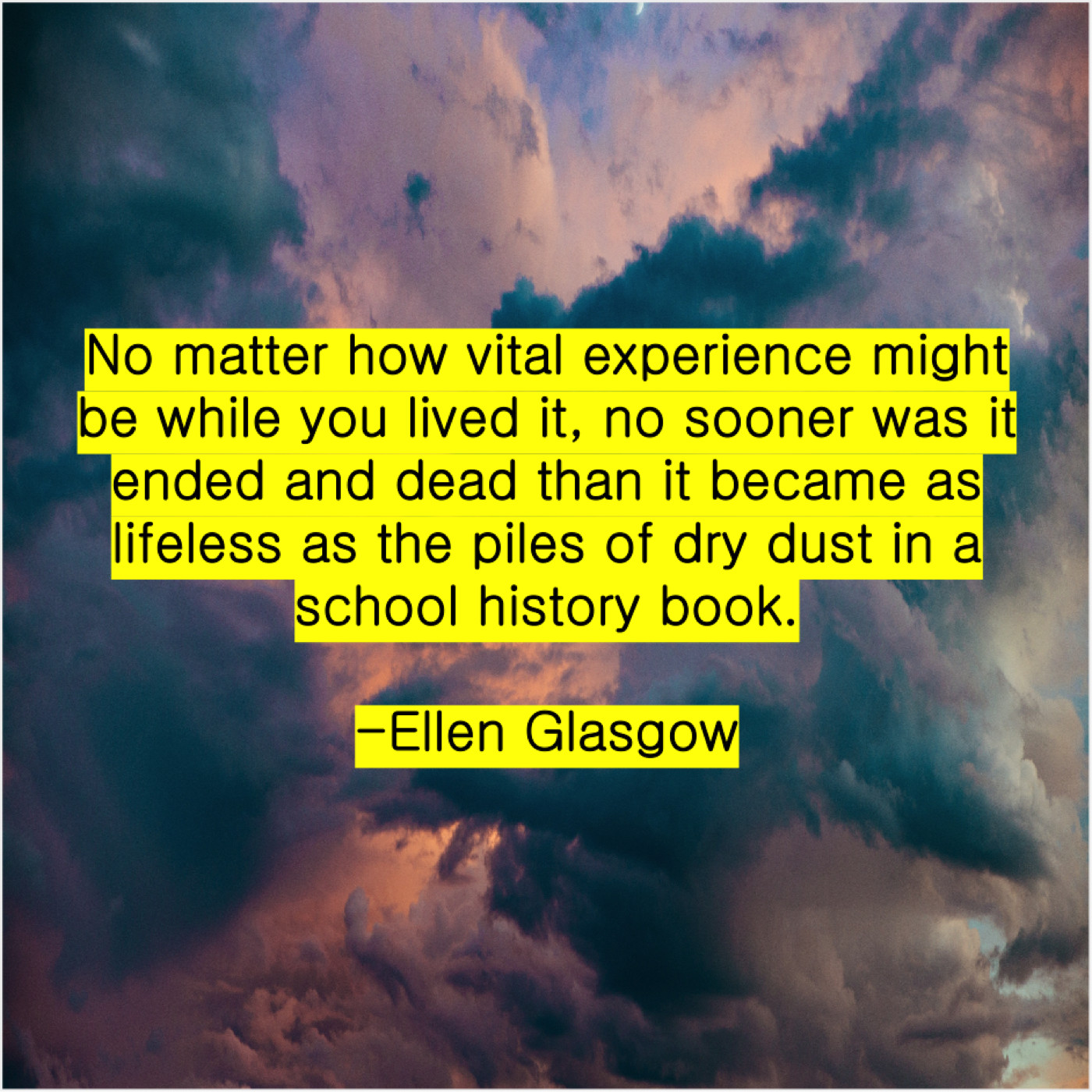 Ellen Glasgow Ellen Glasgow – No matter how vital experience… April 12, 2019 admin “No matter how vital experience might be while you lived it, no sooner was it ended and dead than it became as lifeless as the piles of dry dust in a school history book.”-Ellen Glasgow