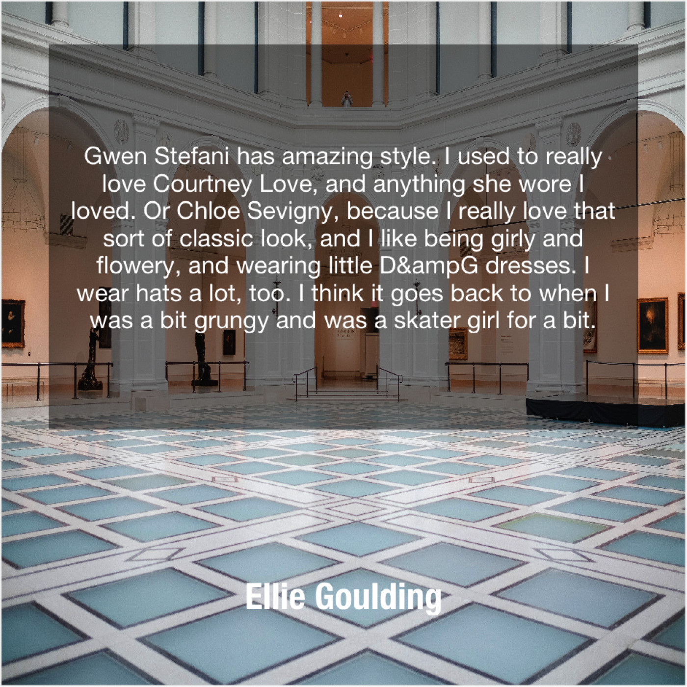 “Gwen Stefani has amazing style. I used to really love Courtney Love, and anything she wore I loved. Or Chloe Sevigny, because I really love that sort of classic look, and I like being girly and flowery, and wearing little D&G dresses. I wear hats a lot, too. I think it goes back to when I was a bit grungy and was a skater girl for a bit.”