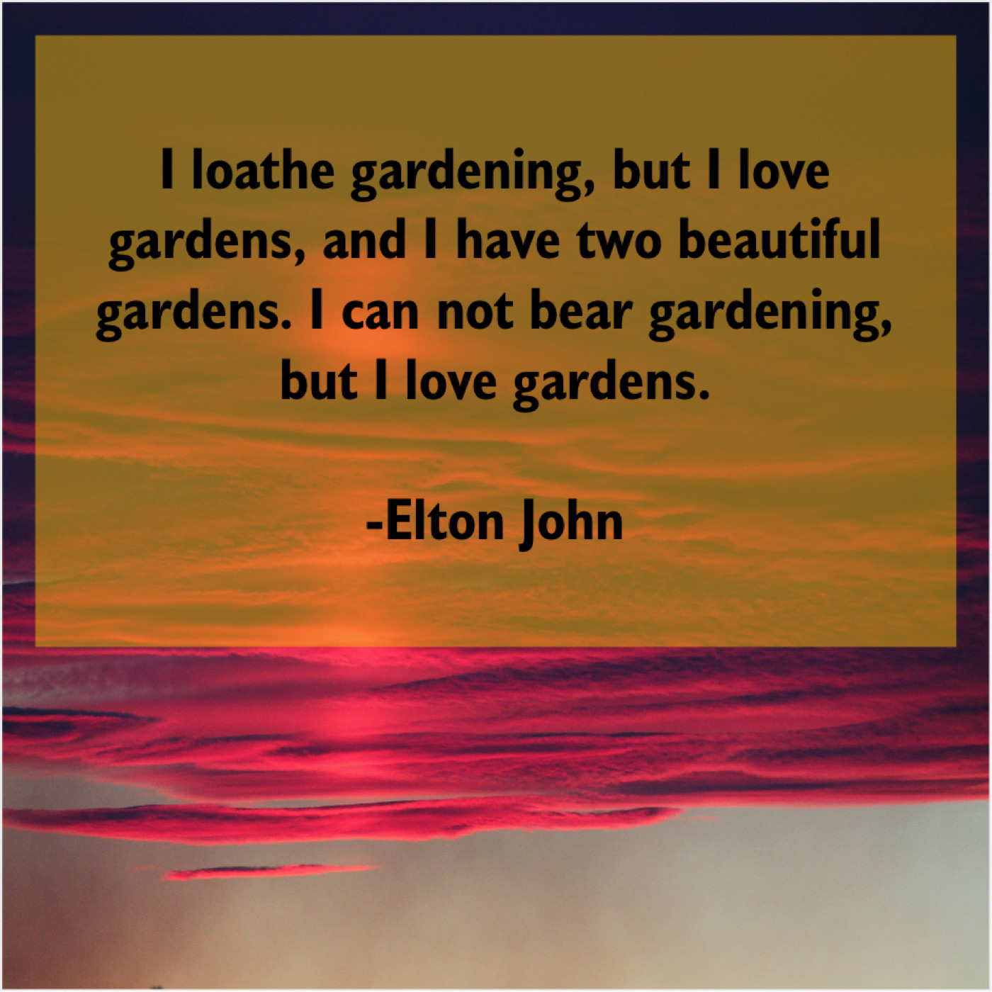 Elton John Elton John – I loathe gardening, but I… August 10, 2019 admin “I loathe gardening, but I love gardens, and I have two beautiful gardens. I can not bear gardening, but I love gardens.”-Elton John