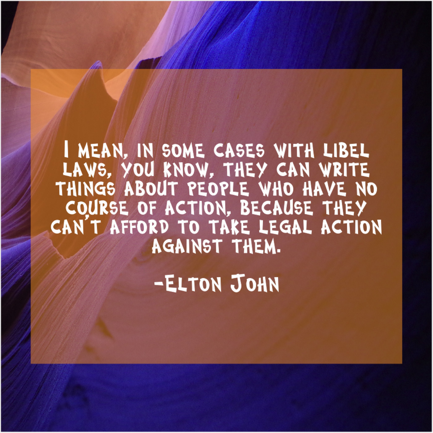 Elton John Elton John – I mean, in some cases… November 13, 2018 admin “I mean, in some cases with libel laws, you know, they can write things about people who have no course of action, because they can’t afford to take legal action against them.”-Elton John