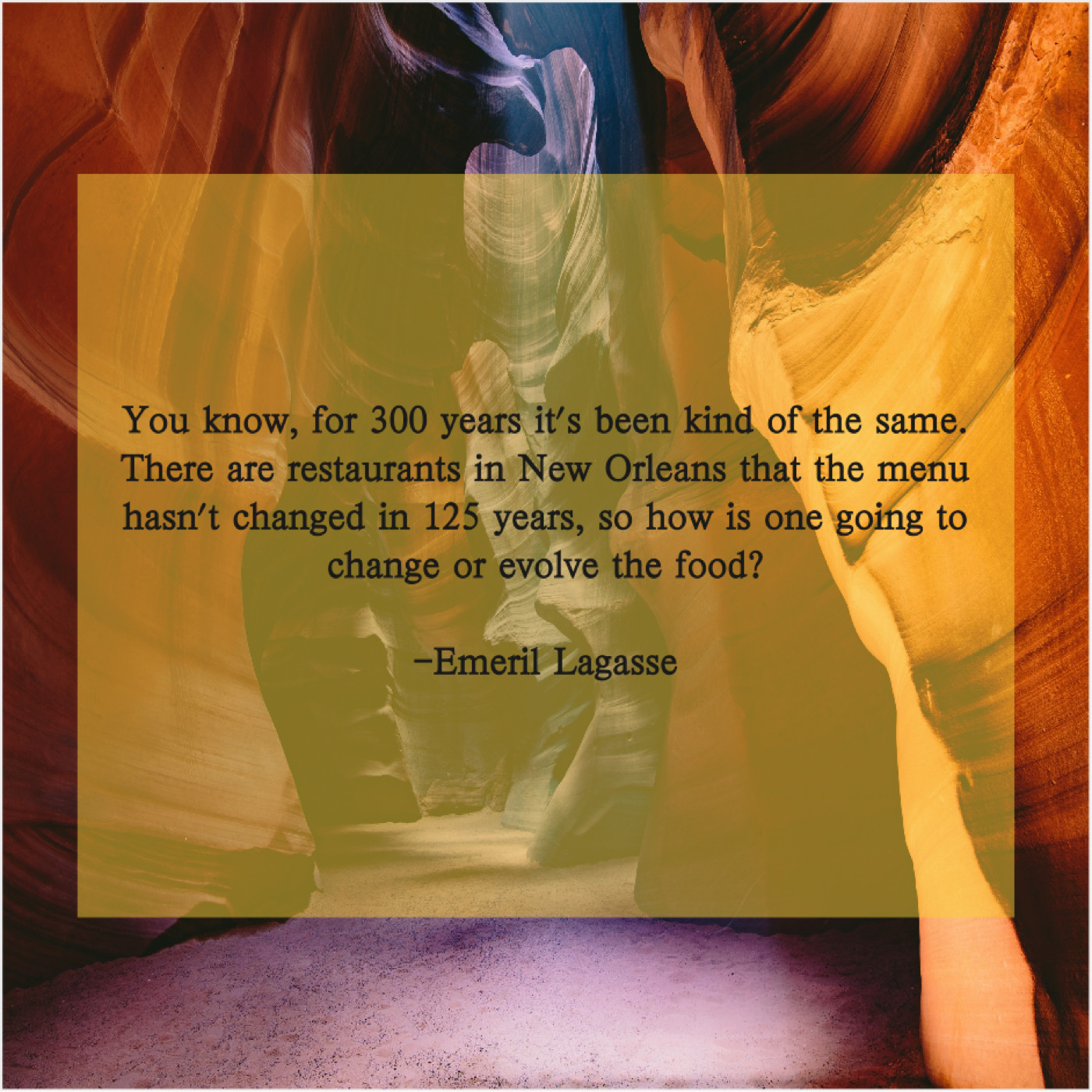 Emeril Lagasse Emeril Lagasse – You know, for 300 years… May 8, 2019 admin “You know, for 300 years it’s been kind of the same. There are restaurants in New Orleans that the menu hasn’t changed in 125 years, so how is one going to change or evolve the food?”-Emeril Lagasse