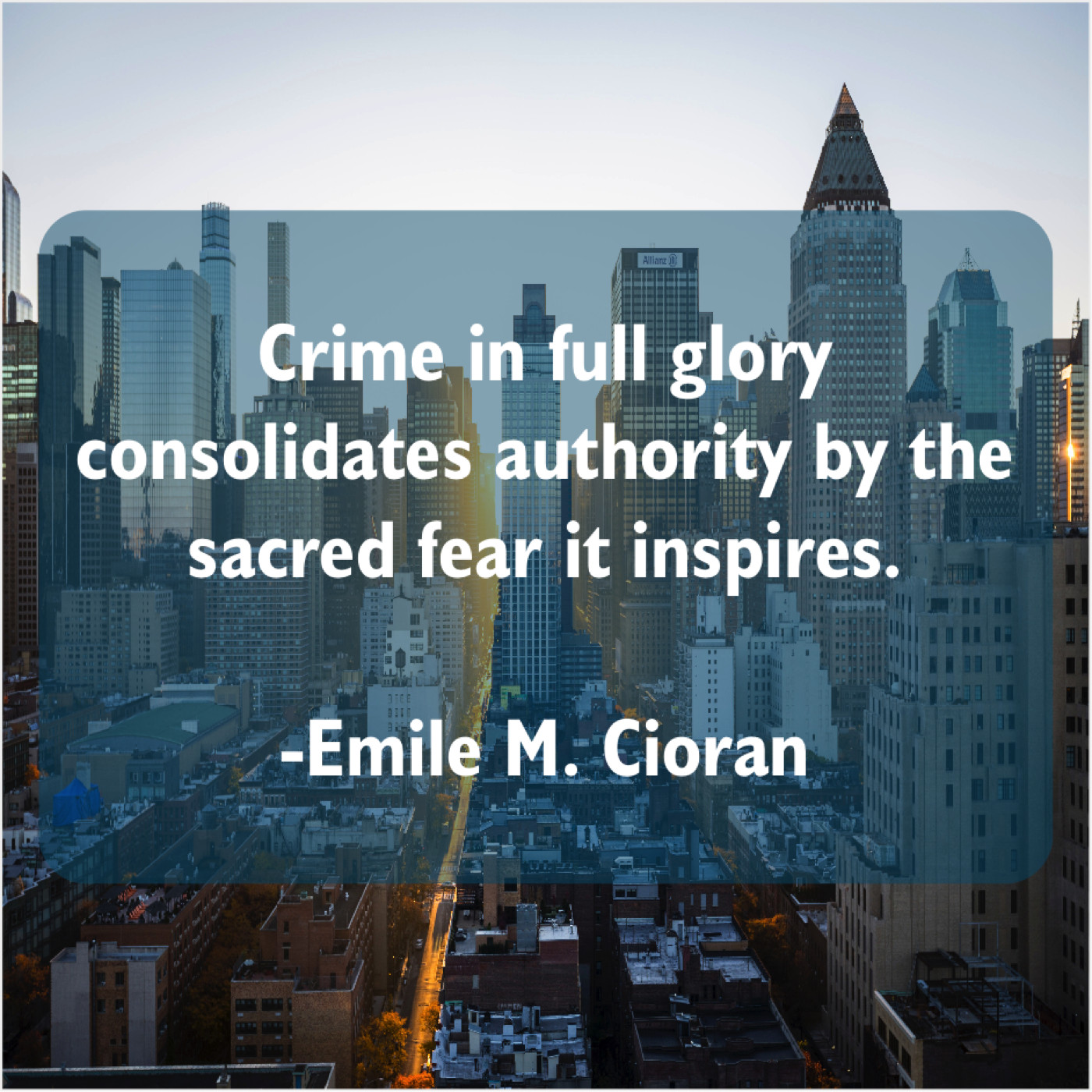 Emile M. Cioran Emile M. Cioran – Crime in full glory consolidates… January 22, 2019 admin “Crime in full glory consolidates authority by the sacred fear it inspires.”-Emile M. Cioran