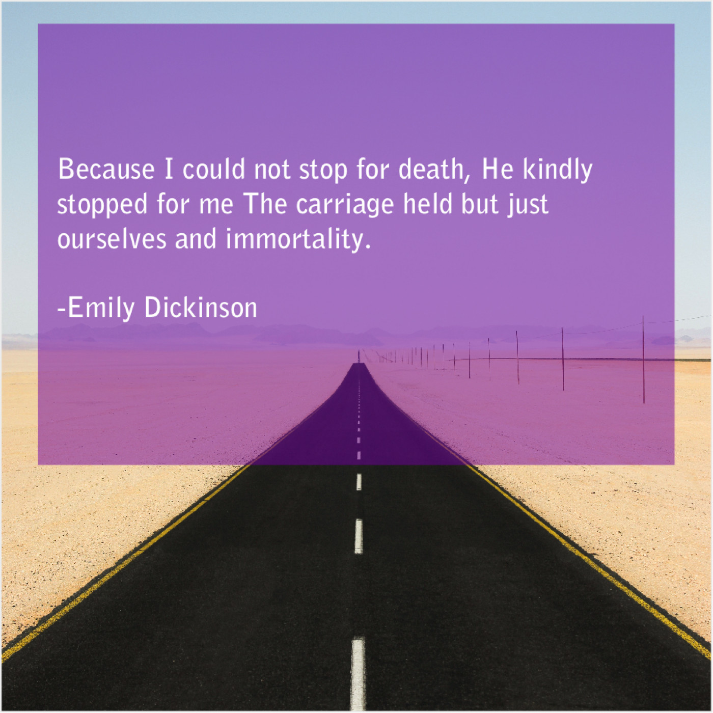 Emily Dickinson Emily Dickinson – Because I could not stop… March 29, 2019 admin “Because I could not stop for death, He kindly stopped for me The carriage held but just ourselves and immortality.”-Emily Dickinson