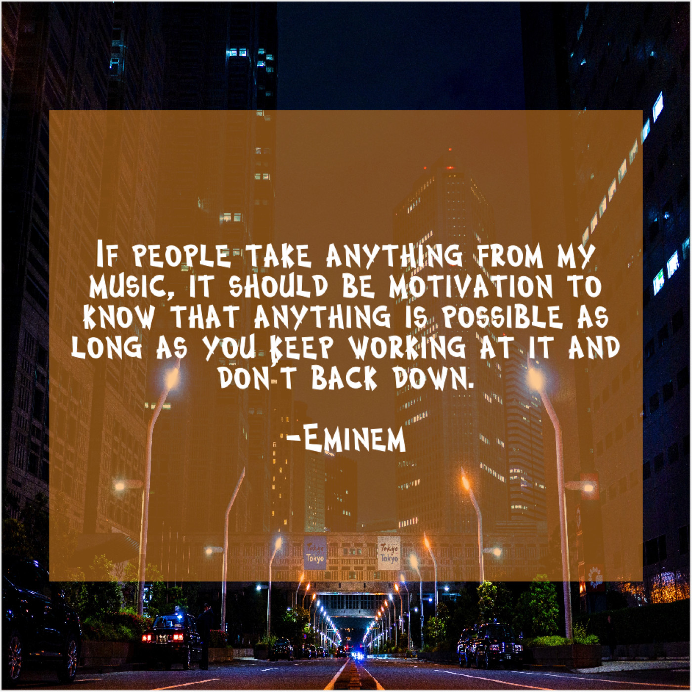 Eminem Eminem – If people take anything from… August 14, 2019 admin “If people take anything from my music, it should be motivation to know that anything is possible as long as you keep working at it and don’t back down.”-Eminem