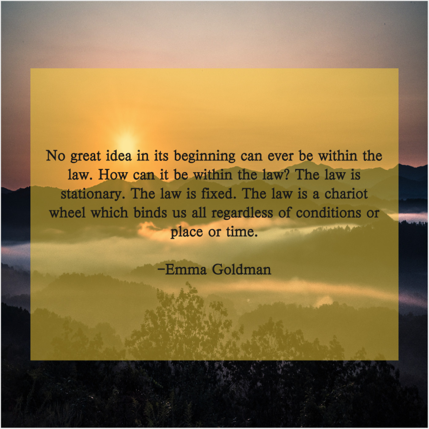 Emma Goldman Emma Goldman – No great idea in its… July 16, 2019 admin “No great idea in its beginning can ever be within the law. How can it be within the law? The law is stationary. The law is fixed. The law is a chariot wheel which binds us all regardless of conditions or place or time.”-Emma Goldman
