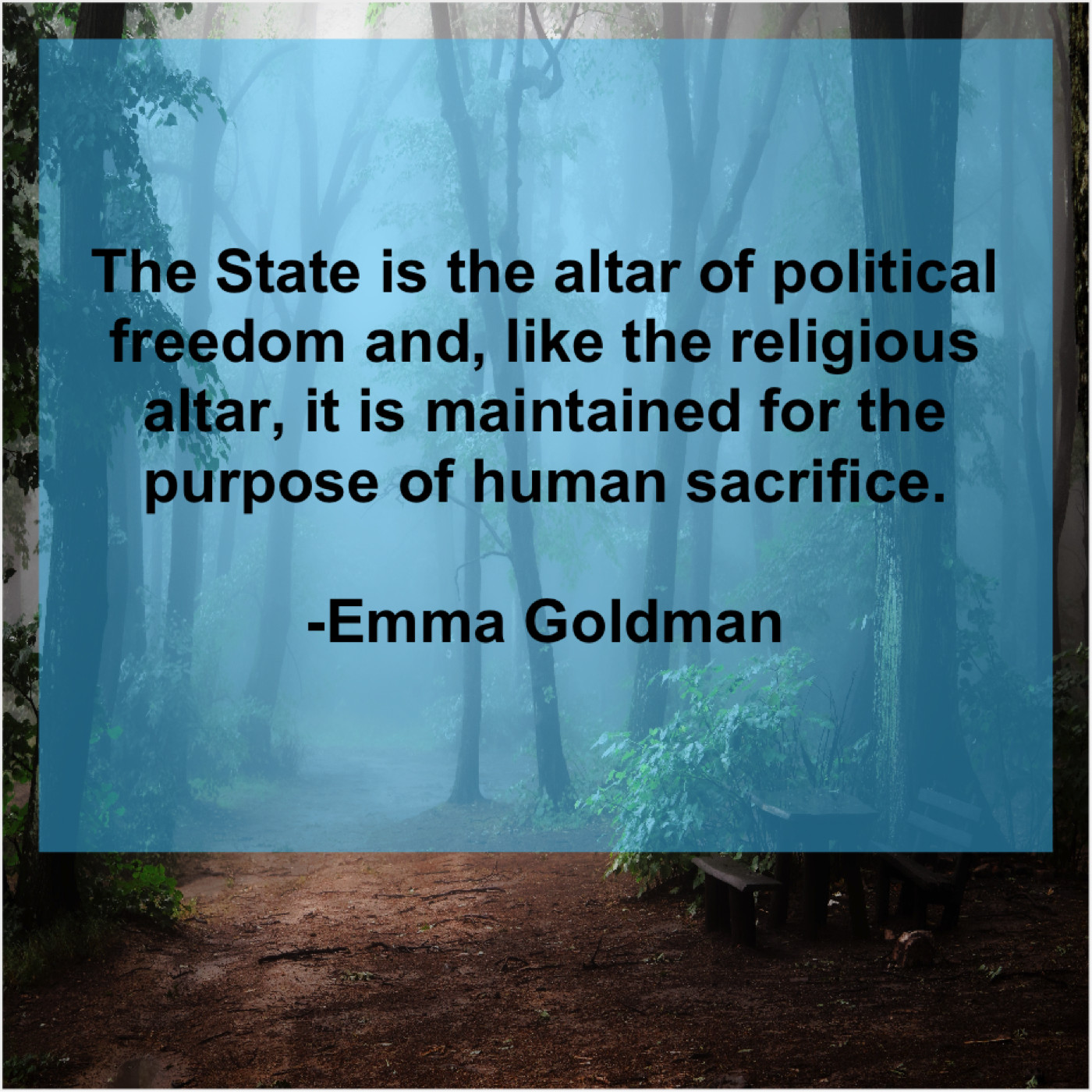 Emma Goldman Emma Goldman – The State is the altar… April 19, 2019 admin “The State is the altar of political freedom and, like the religious altar, it is maintained for the purpose of human sacrifice.”-Emma Goldman