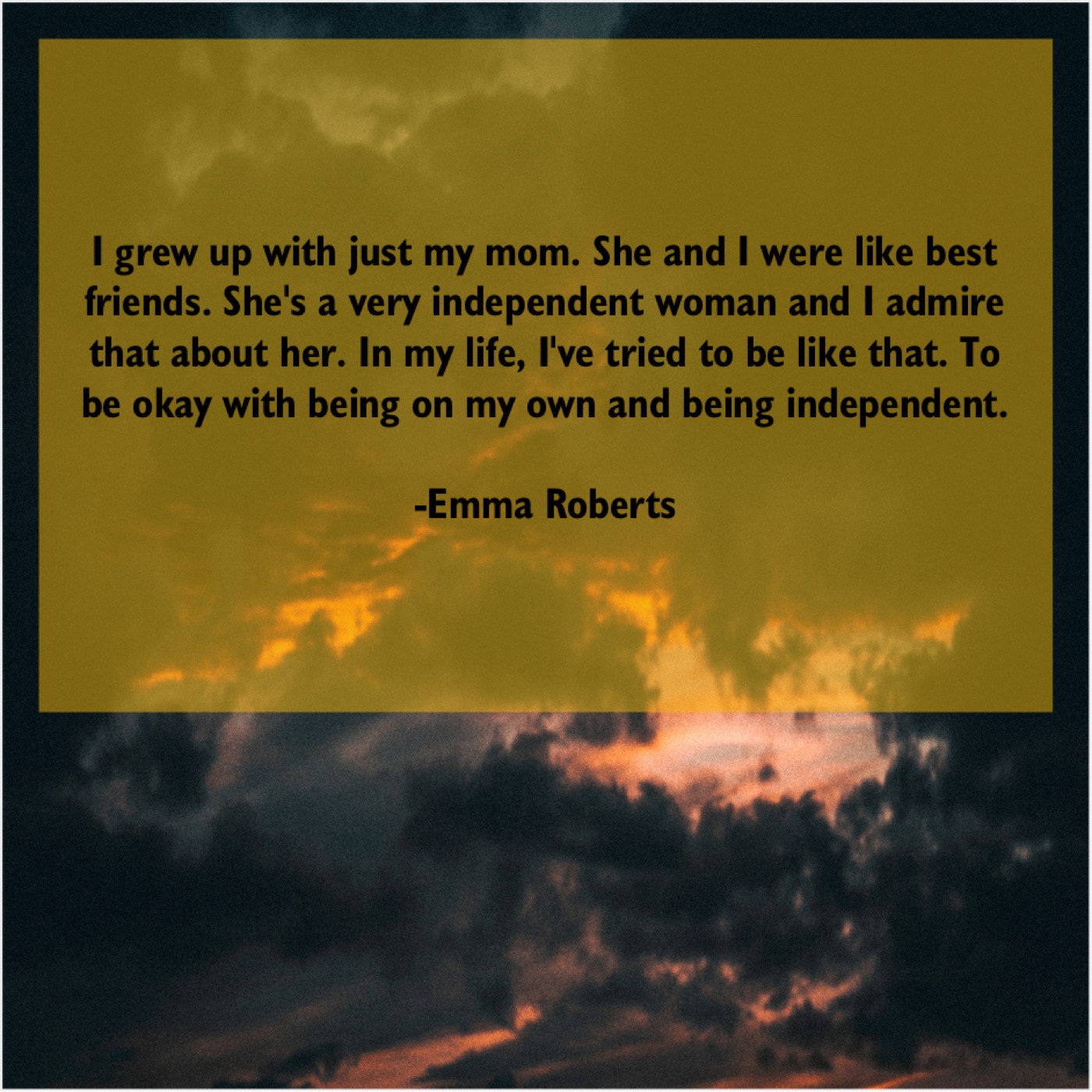 Emma Roberts Emma Roberts – I grew up with just… August 12, 2019 admin “I grew up with just my mom. She and I were like best friends. She’s a very independent woman and I admire that about her. In my life, I’ve tried to be like that. To be okay with being on my own and being independent.”-Emma Roberts