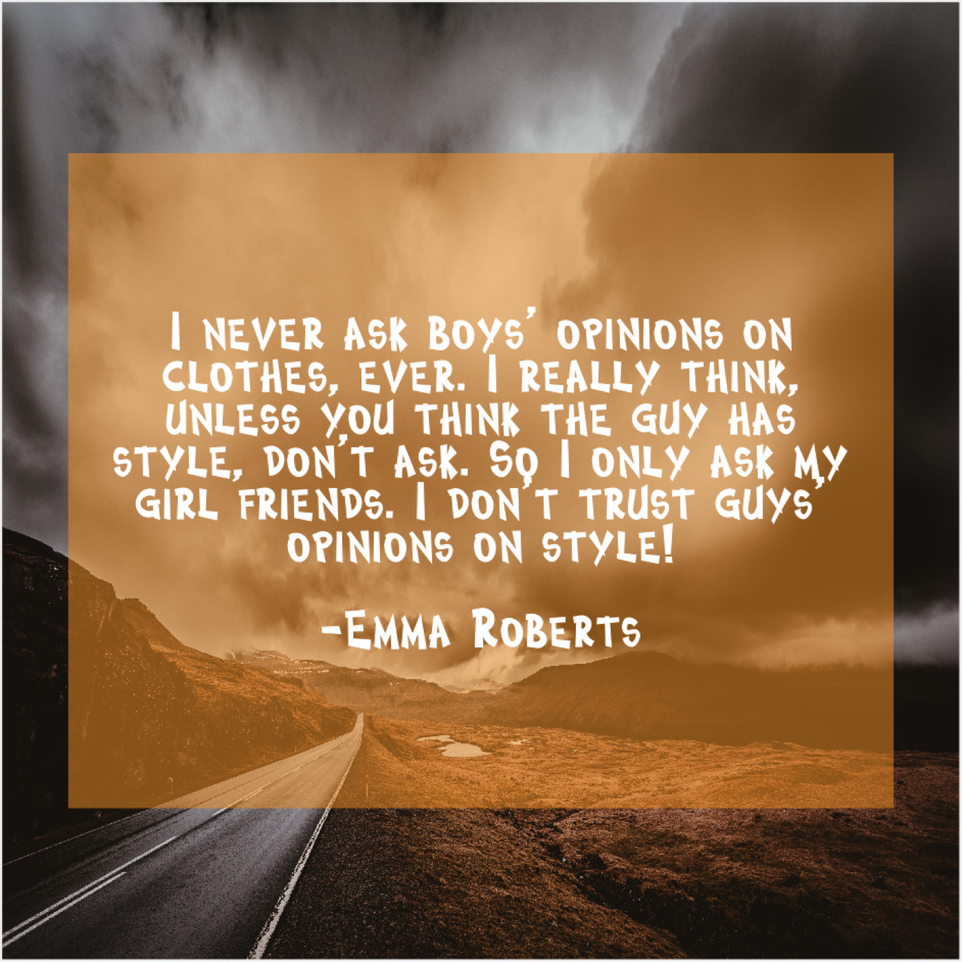 Emma Roberts Emma Roberts – I never ask boys’ opinions… May 21, 2019 admin “I never ask boys’ opinions on clothes, ever. I really think, unless you think the guy has style, don’t ask. So I only ask my girl friends. I don’t trust guys’ opinions on style!”-Emma Roberts