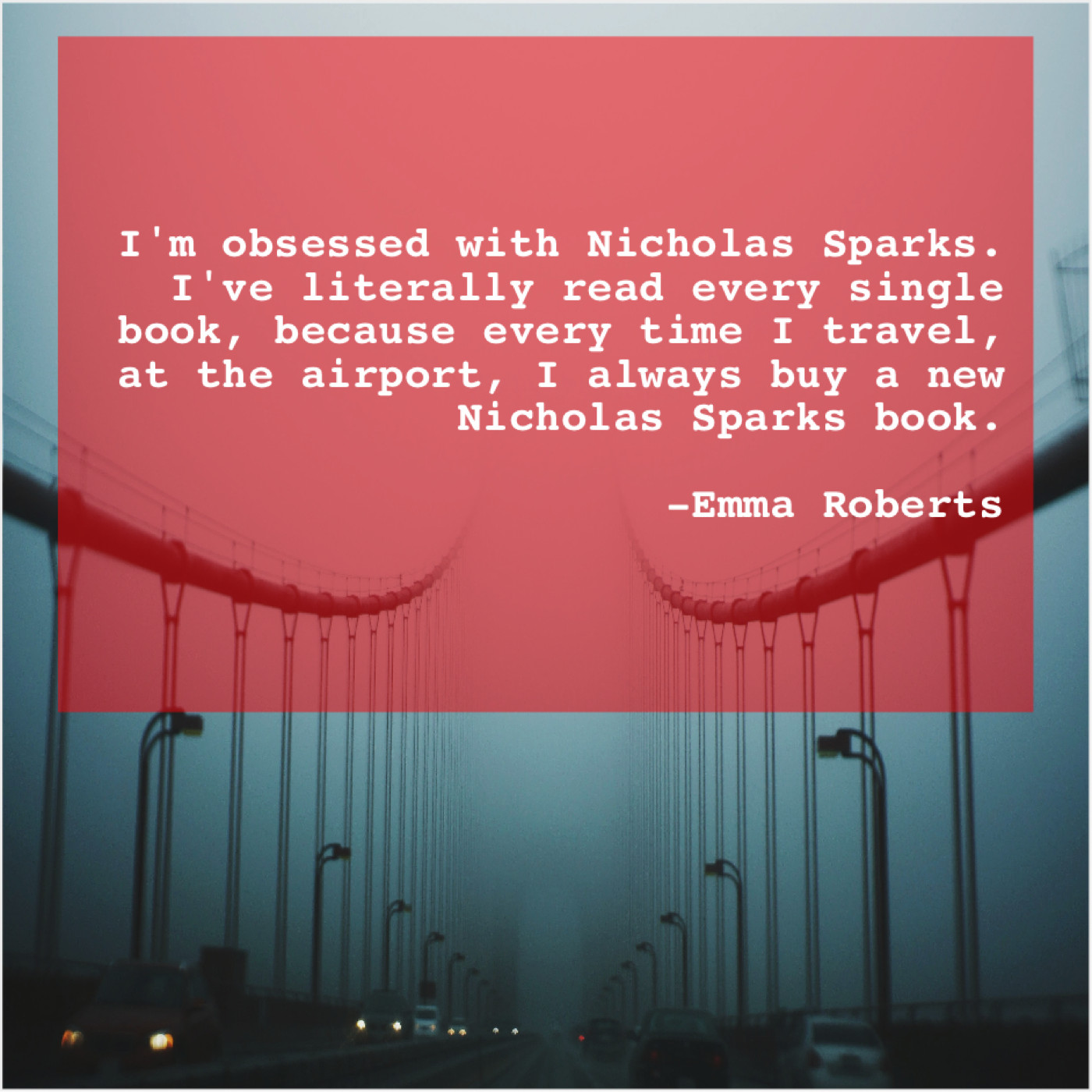 Emma Roberts Emma Roberts – I’m obsessed with Nicholas Sparks… February 27, 2019 admin “I’m obsessed with Nicholas Sparks. I’ve literally read every single book, because every time I travel, at the airport, I always buy a new Nicholas Sparks book.”-Emma Roberts