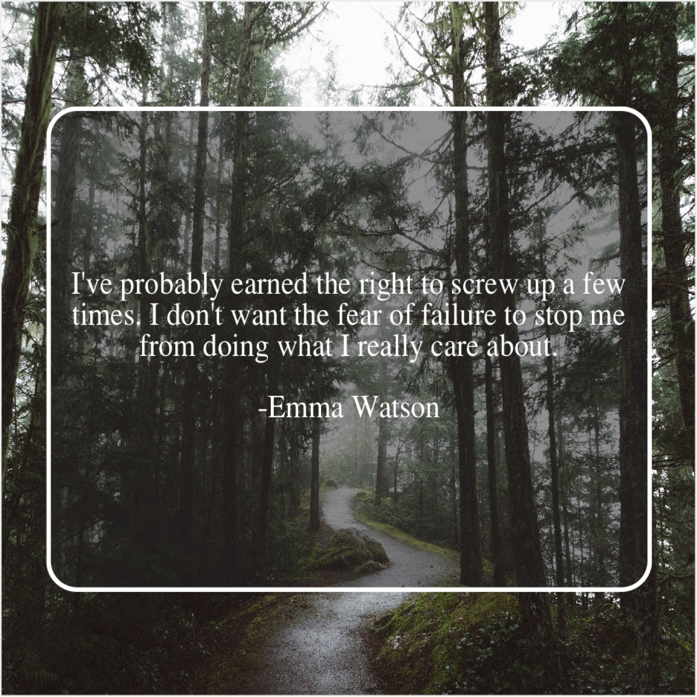 Emma Watson Emma Watson – I’ve probably earned the right… July 2, 2019 admin “I’ve probably earned the right to screw up a few times. I don’t want the fear of failure to stop me from doing what I really care about.”-Emma Watson