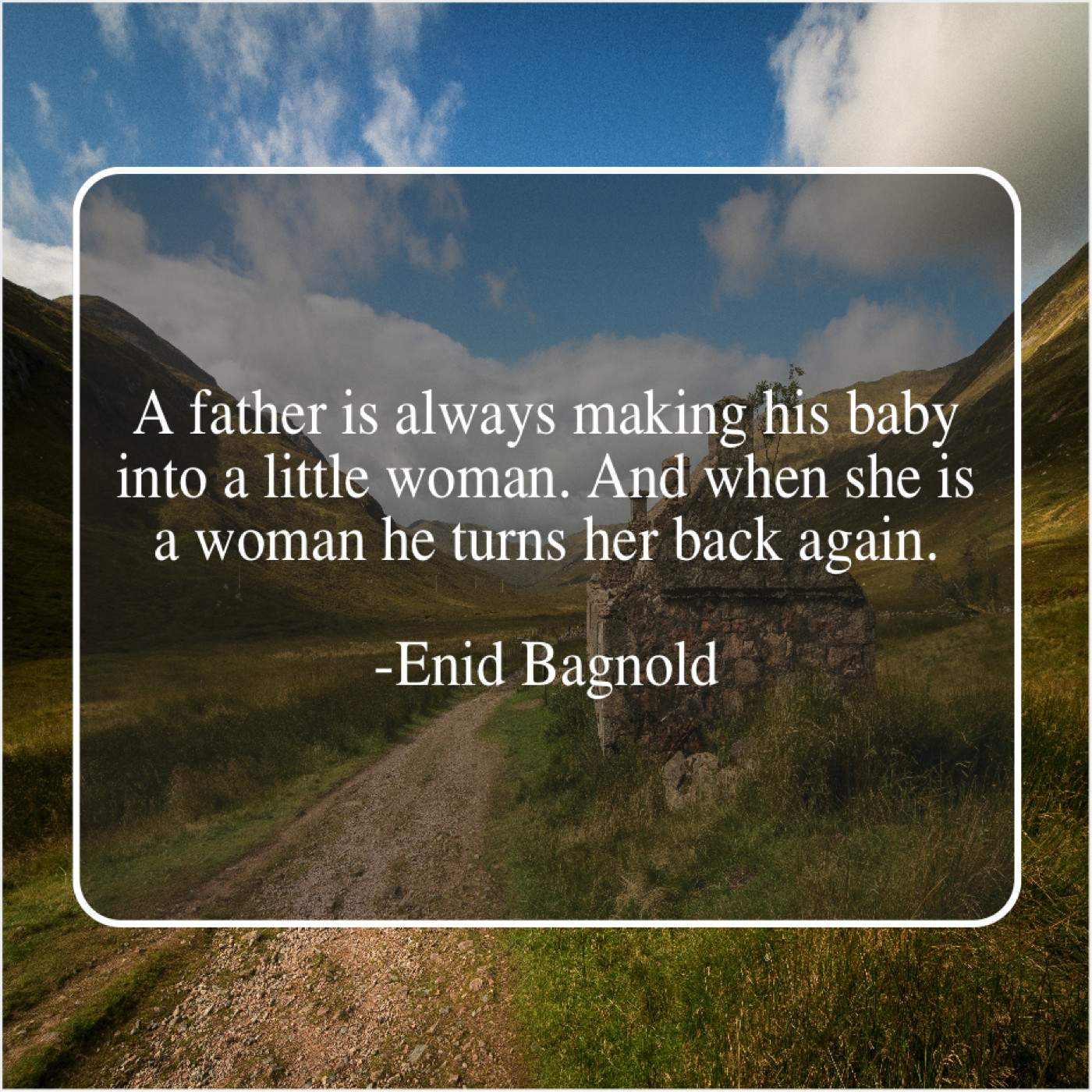 Enid Bagnold Enid Bagnold – A father is always making… April 27, 2019 admin “A father is always making his baby into a little woman. And when she is a woman he turns her back again.”-Enid Bagnold