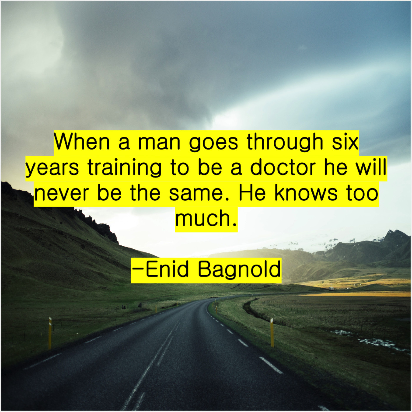 Enid Bagnold Enid Bagnold – When a man goes through… November 11, 2018 admin “When a man goes through six years training to be a doctor he will never be the same. He knows too much.”-Enid Bagnold