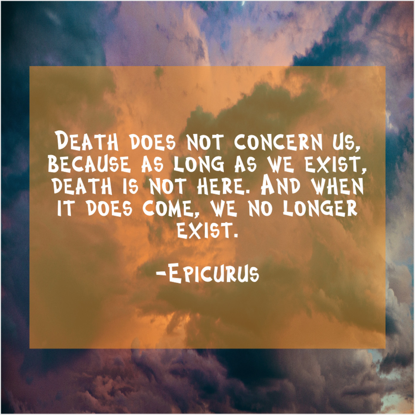 Epicurus Epicurus – Death does not concern us… June 5, 2019 admin “Death does not concern us, because as long as we exist, death is not here. And when it does come, we no longer exist.”-Epicurus