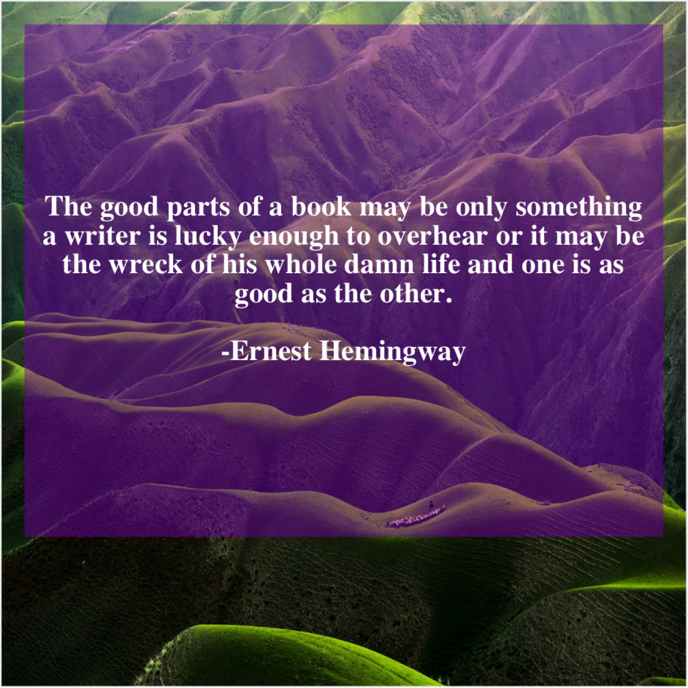 Ernest Hemingway Ernest Hemingway – The good parts of a… April 7, 2019 admin “The good parts of a book may be only something a writer is lucky enough to overhear or it may be the wreck of his whole damn life and one is as good as the other.”-Ernest Hemingway