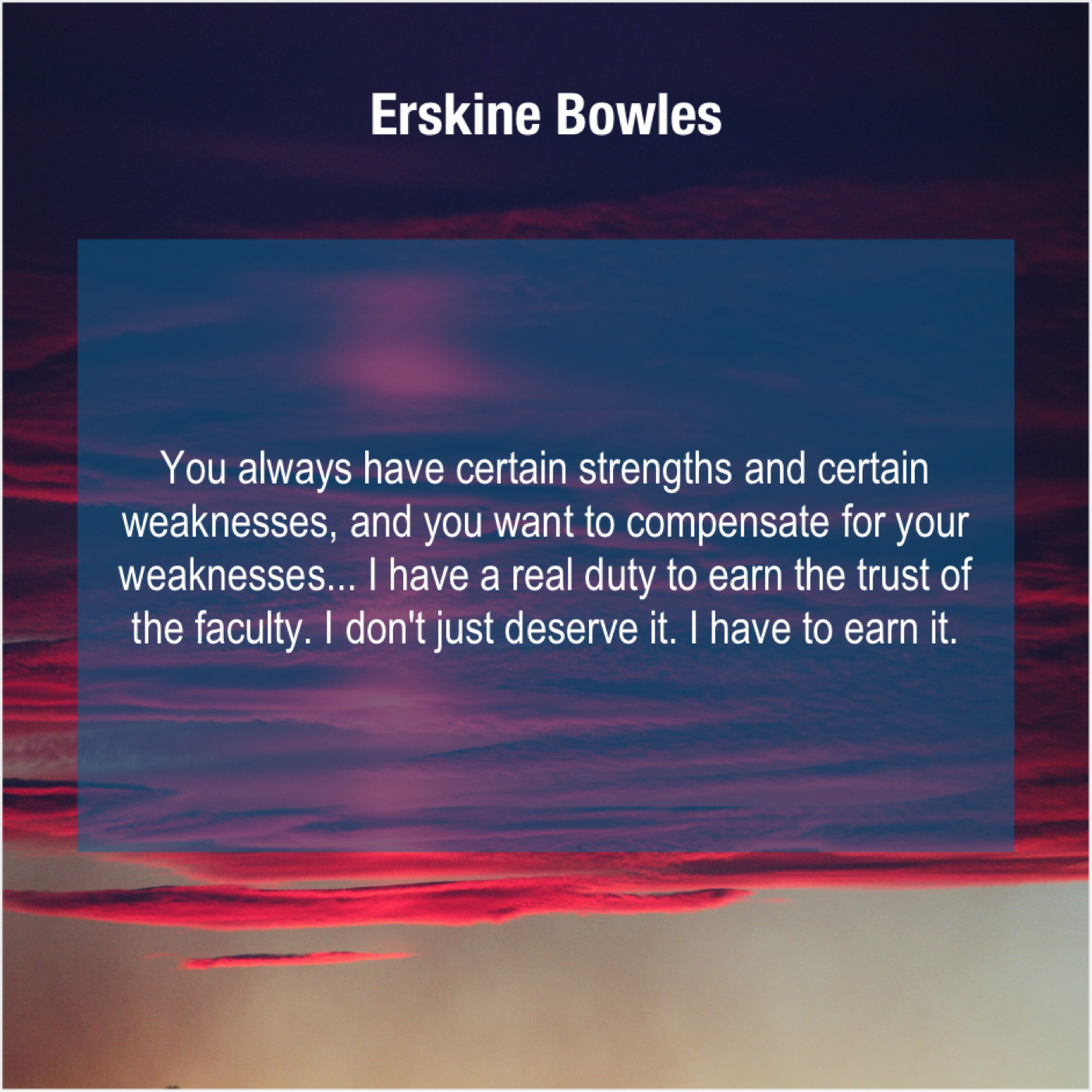 Erskine Bowles Erskine Bowles – You always have certain strengths… November 13, 2018 admin “You always have certain strengths and certain weaknesses, and you want to compensate for your weaknesses… I have a real duty to earn the trust of the faculty. I don’t just deserve it. I have to earn it.”-Erskine Bowles