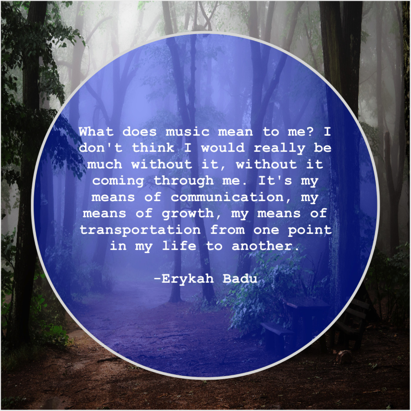 Erykah Badu Erykah Badu – What does music mean to… May 12, 2019 admin “What does music mean to me? I don’t think I would really be much without it, without it coming through me. It’s my means of communication, my means of growth, my means of transportation from one point in my life to another.”-Erykah Badu