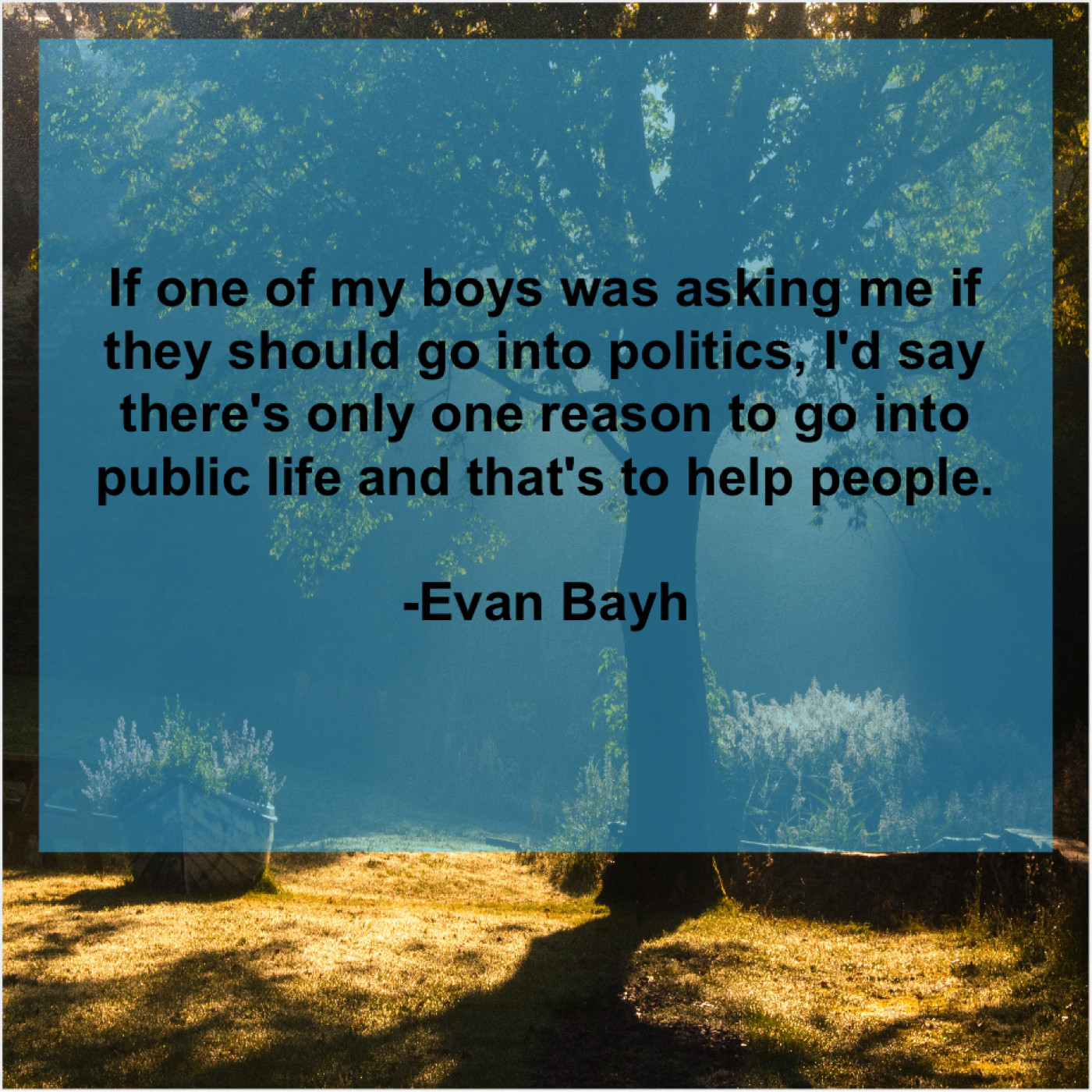Evan Bayh Evan Bayh – If one of my boys… September 21, 2019 admin “If one of my boys was asking me if they should go into politics, I’d say there’s only one reason to go into public life and that’s to help people.”-Evan Bayh