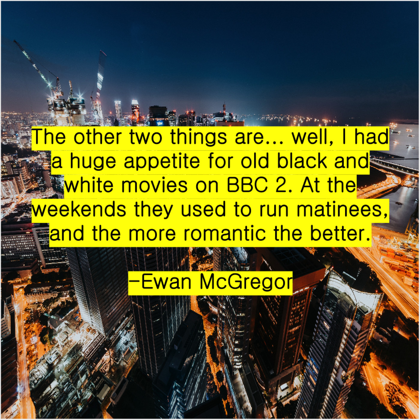 Ewan McGregor Ewan McGregor – The other two things are… March 15, 2019 admin “The other two things are… well, I had a huge appetite for old black and white movies on BBC 2. At the weekends they used to run matinees, and the more romantic the better.”-Ewan McGregor