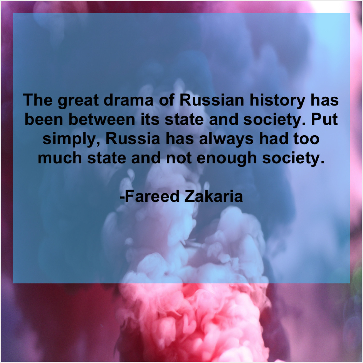 Fareed Zakaria Fareed Zakaria – The great drama of Russian… April 17, 2019 admin “The great drama of Russian history has been between its state and society. Put simply, Russia has always had too much state and not enough society.”-Fareed Zakaria