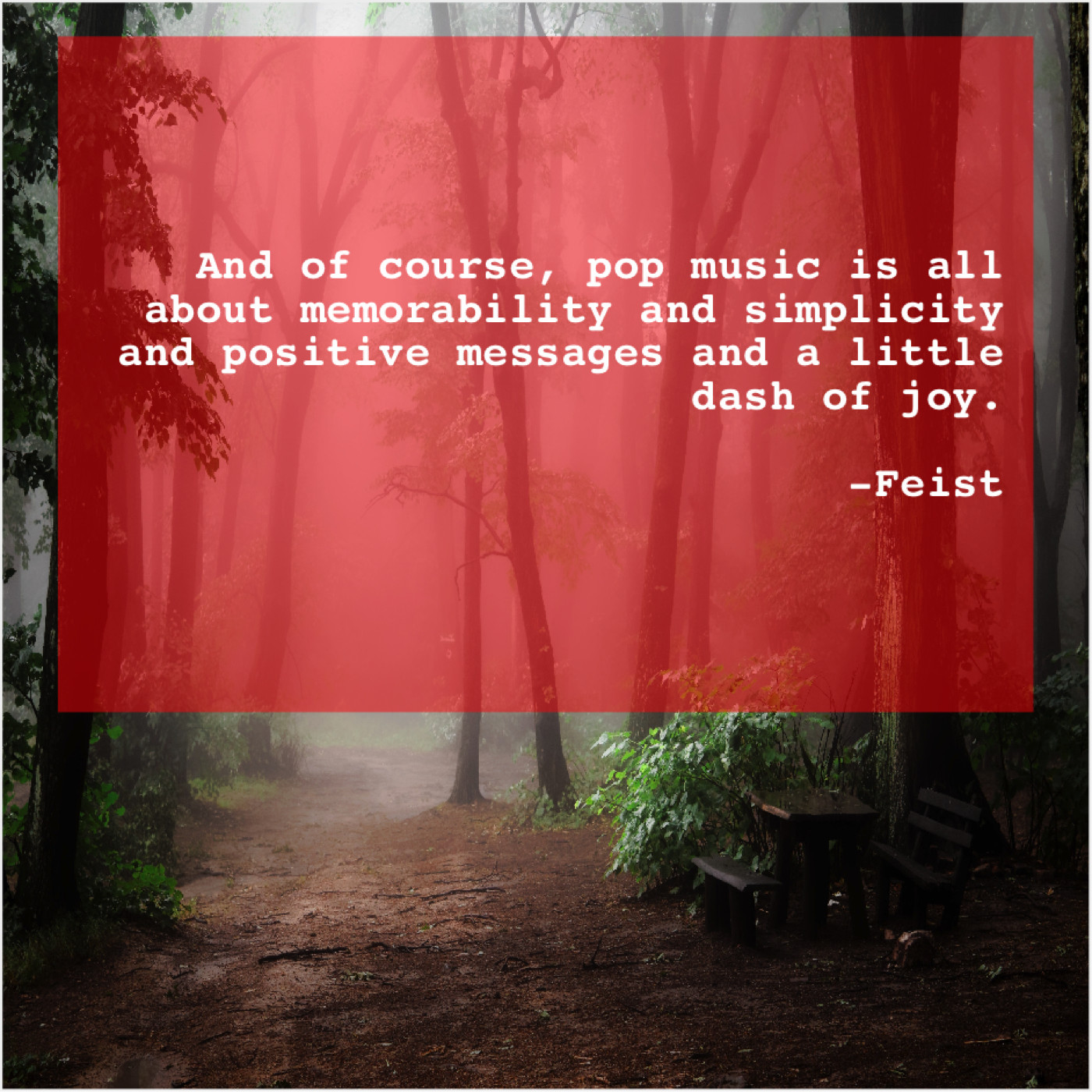 Feist Feist – And of course, pop music… February 25, 2019 admin “And of course, pop music is all about memorability and simplicity and positive messages and a little dash of joy.”-Feist