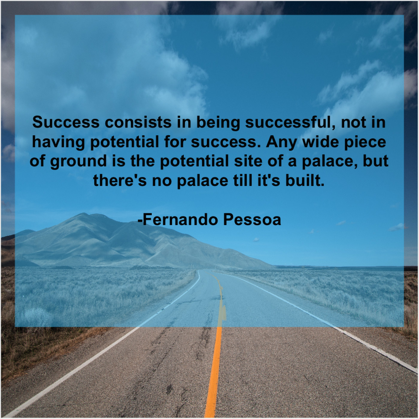 Fernando Pessoa Fernando Pessoa – Success consists in being successful… July 7, 2019 admin “Success consists in being successful, not in having potential for success. Any wide piece of ground is the potential site of a palace, but there’s no palace till it’s built.”-Fernando Pessoa