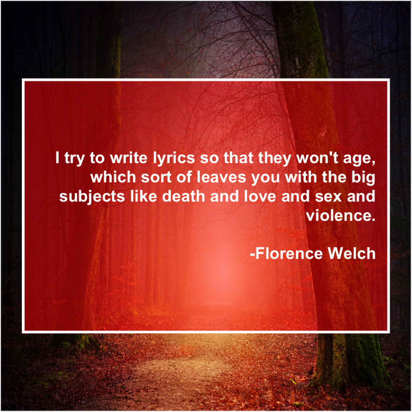 Florence Welch Florence Welch – I try to write lyrics… April 24, 2019 admin “I try to write lyrics so that they won’t age, which sort of leaves you with the big subjects like death and love and sex and violence.”-Florence Welch