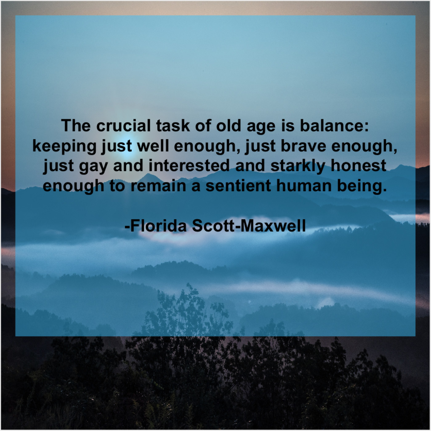 Florida Scott-Maxwell Florida Scott-Maxwell – The crucial task of old… October 31, 2018 admin “The crucial task of old age is balance: keeping just well enough, just brave enough, just gay and interested and starkly honest enough to remain a sentient human being.”-Florida Scott-Maxwell