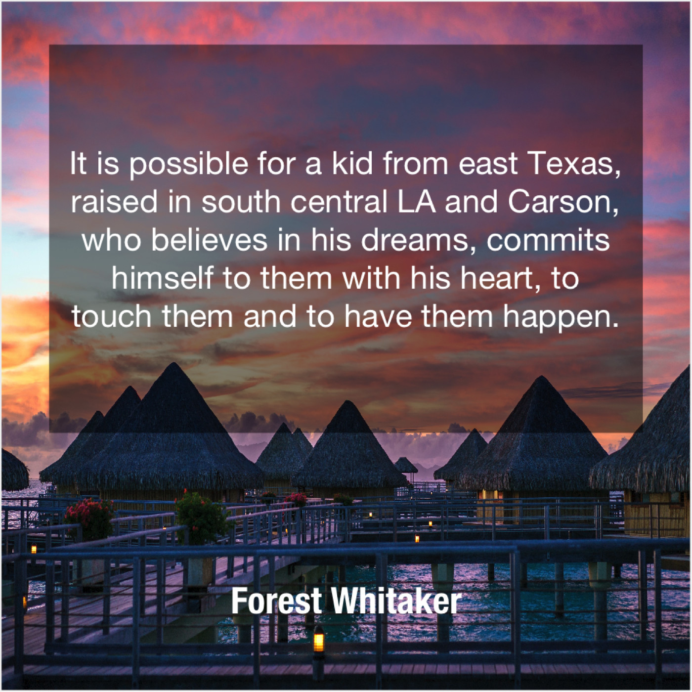 Forest Whitaker Forest Whitaker – It is possible for a… July 8, 2019 admin “It is possible for a kid from east Texas, raised in south central LA and Carson, who believes in his dreams, commits himself to them with his heart, to touch them and to have them happen.”-Forest Whitaker