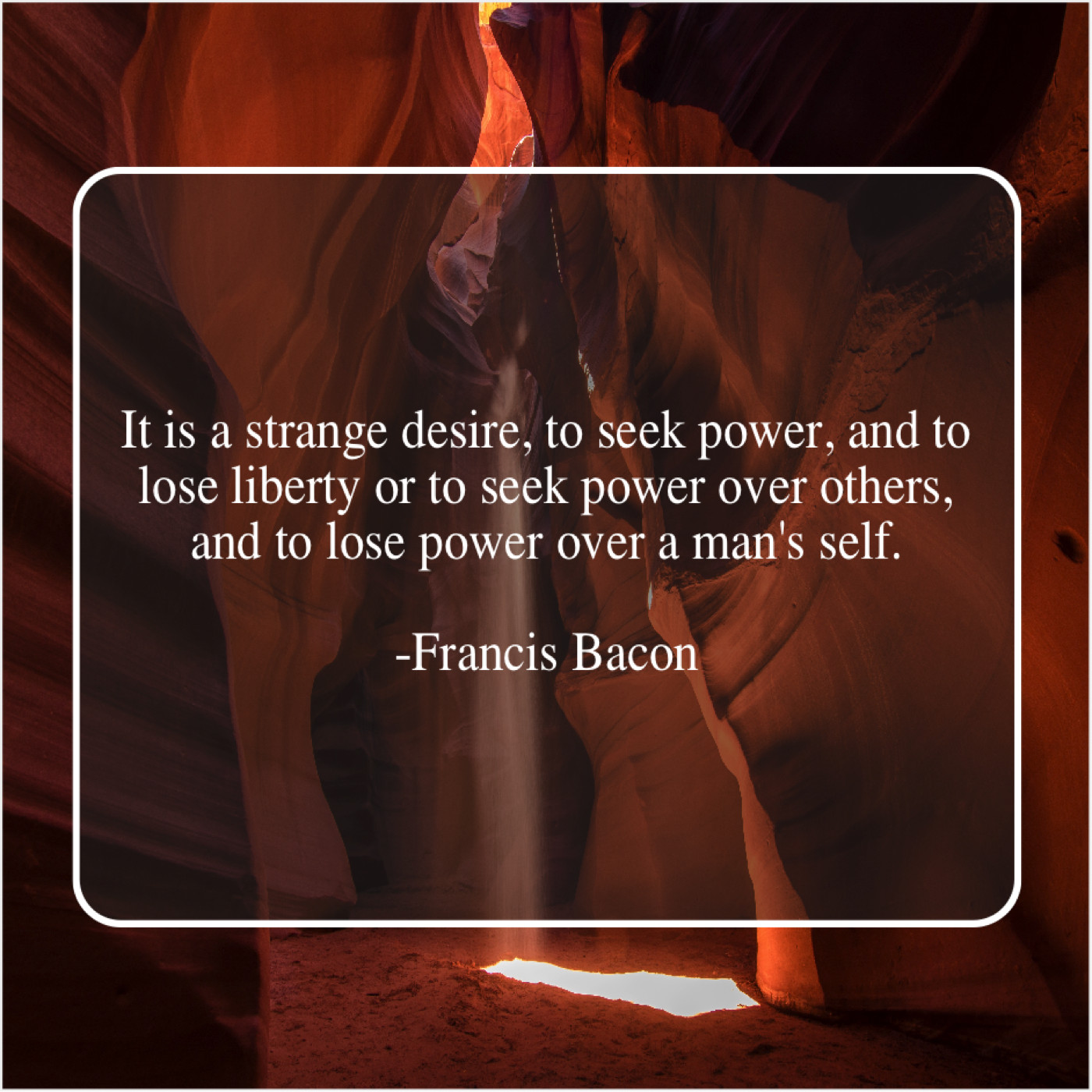Francis Bacon Francis Bacon – It is a strange desire… October 30, 2018 admin “It is a strange desire, to seek power, and to lose liberty or to seek power over others, and to lose power over a man’s self.”-Francis Bacon