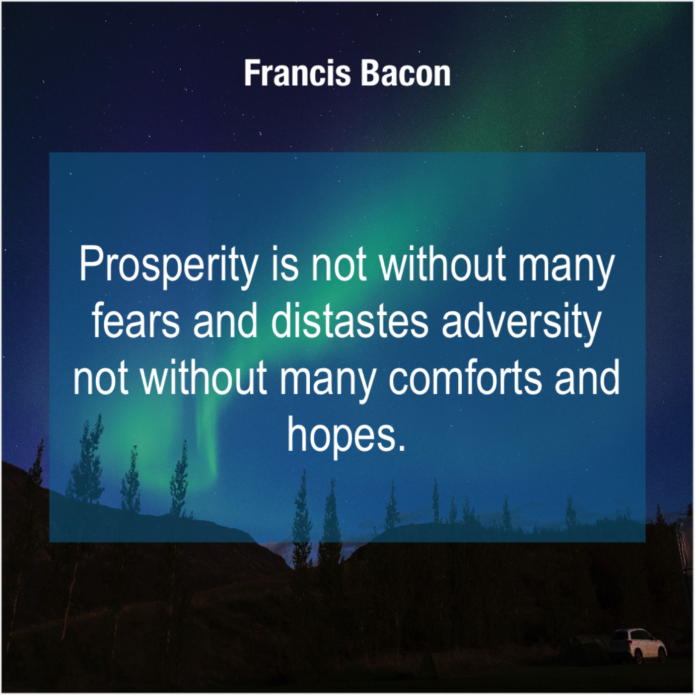Francis Bacon Francis Bacon – Prosperity is not without many… July 11, 2019 admin “Prosperity is not without many fears and distastes adversity not without many comforts and hopes.”-Francis Bacon