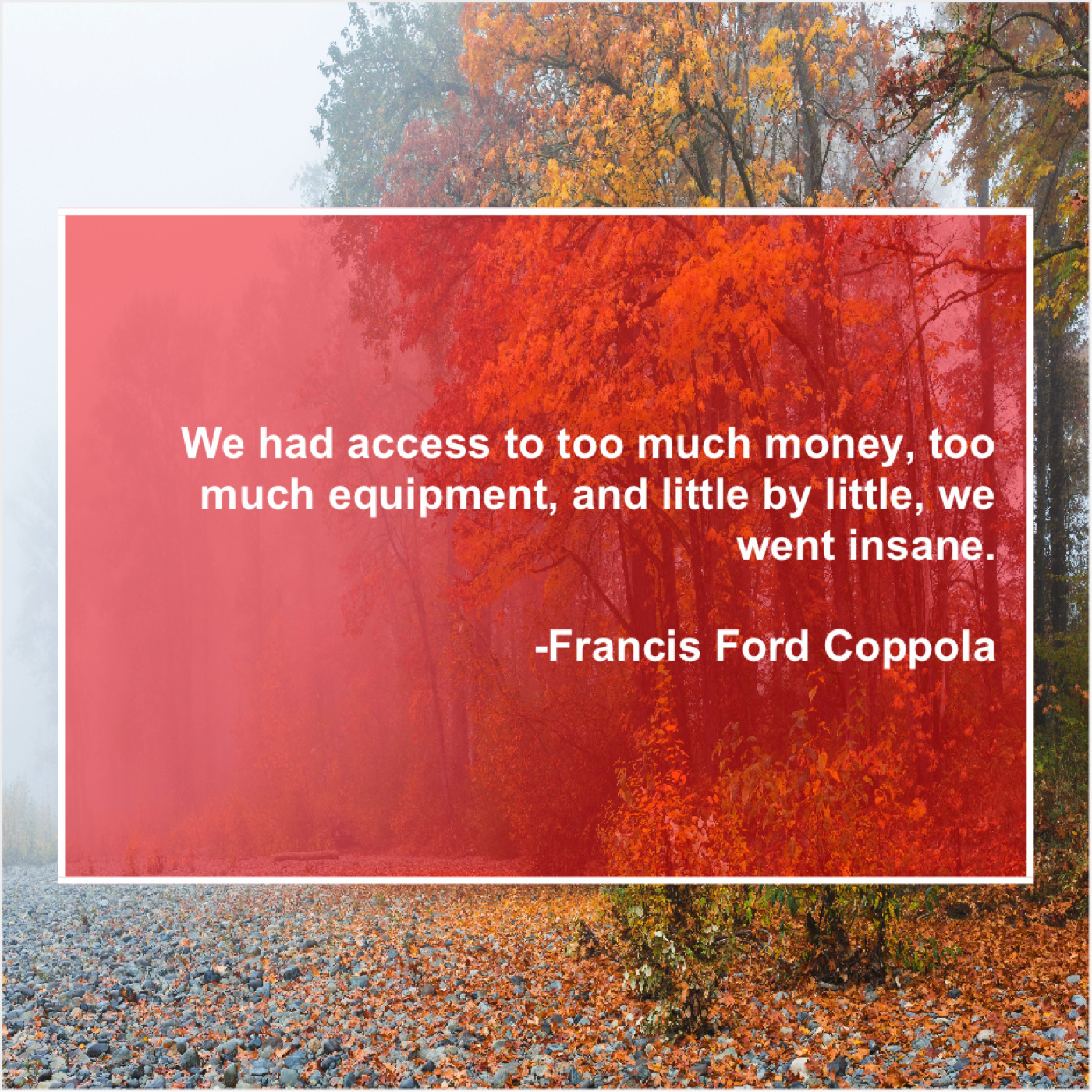 Francis Ford Coppola Francis Ford Coppola – We had access to too… December 16, 2018 admin “We had access to too much money, too much equipment, and little by little, we went insane.”-Francis Ford Coppola