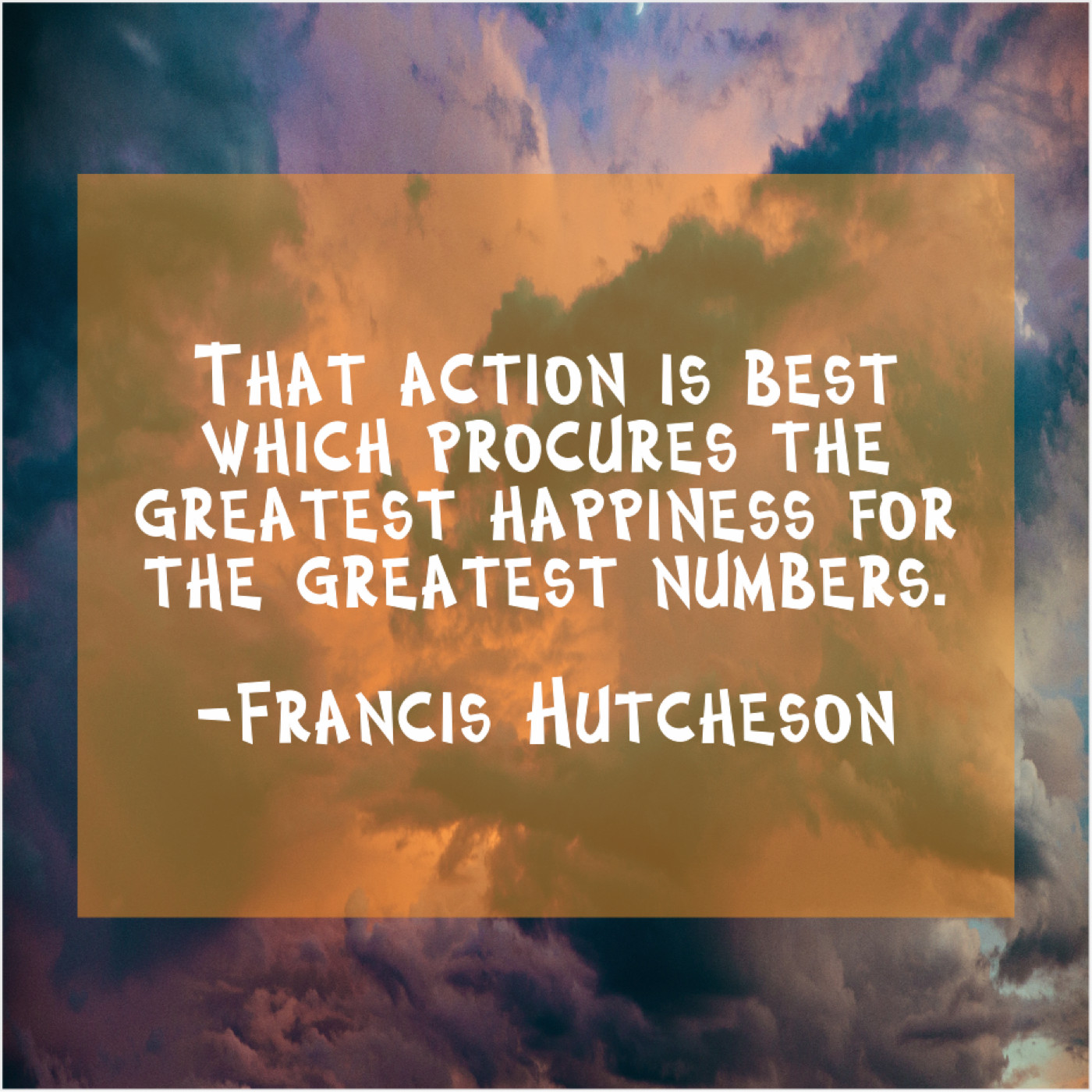 Francis Hutcheson Francis Hutcheson – That action is best which… July 4, 2019 admin “That action is best which procures the greatest happiness for the greatest numbers.”-Francis Hutcheson