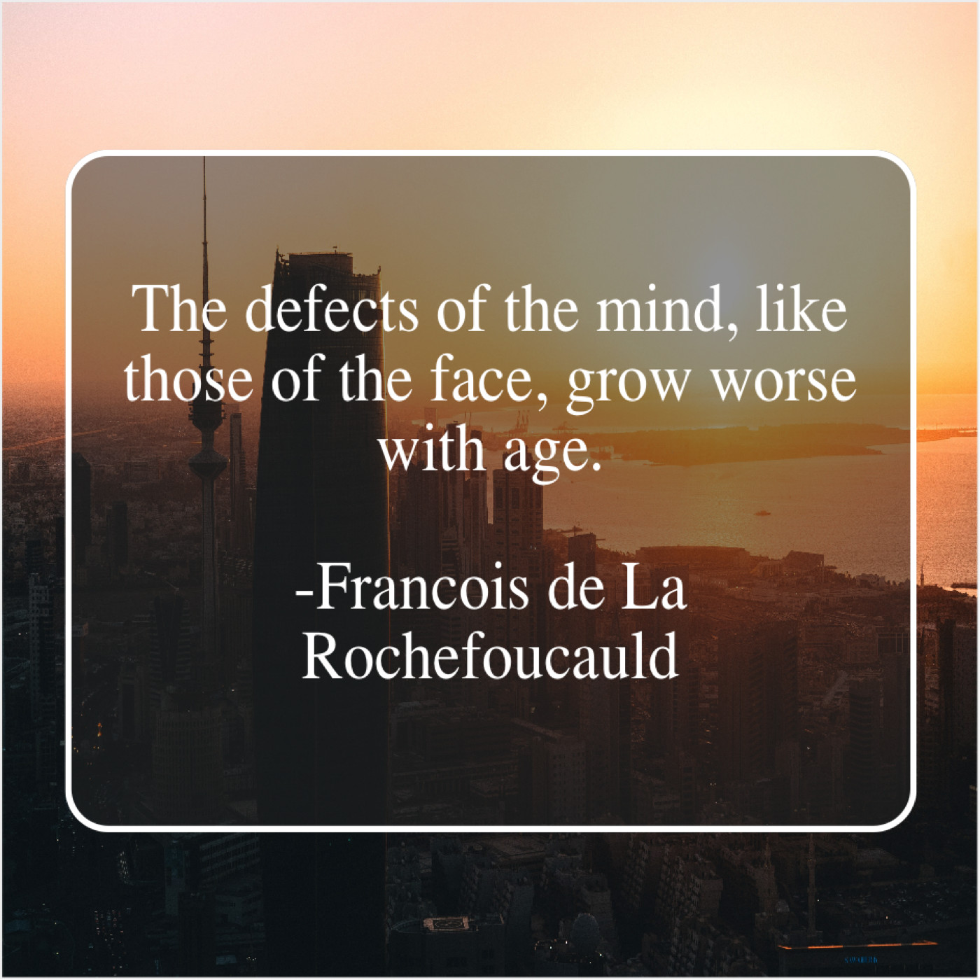 Francois de La Rochefoucauld Francois de La Rochefoucauld – The defects of the mind… November 12, 2018 admin “The defects of the mind, like those of the face, grow worse with age.”-Francois de La Rochefoucauld