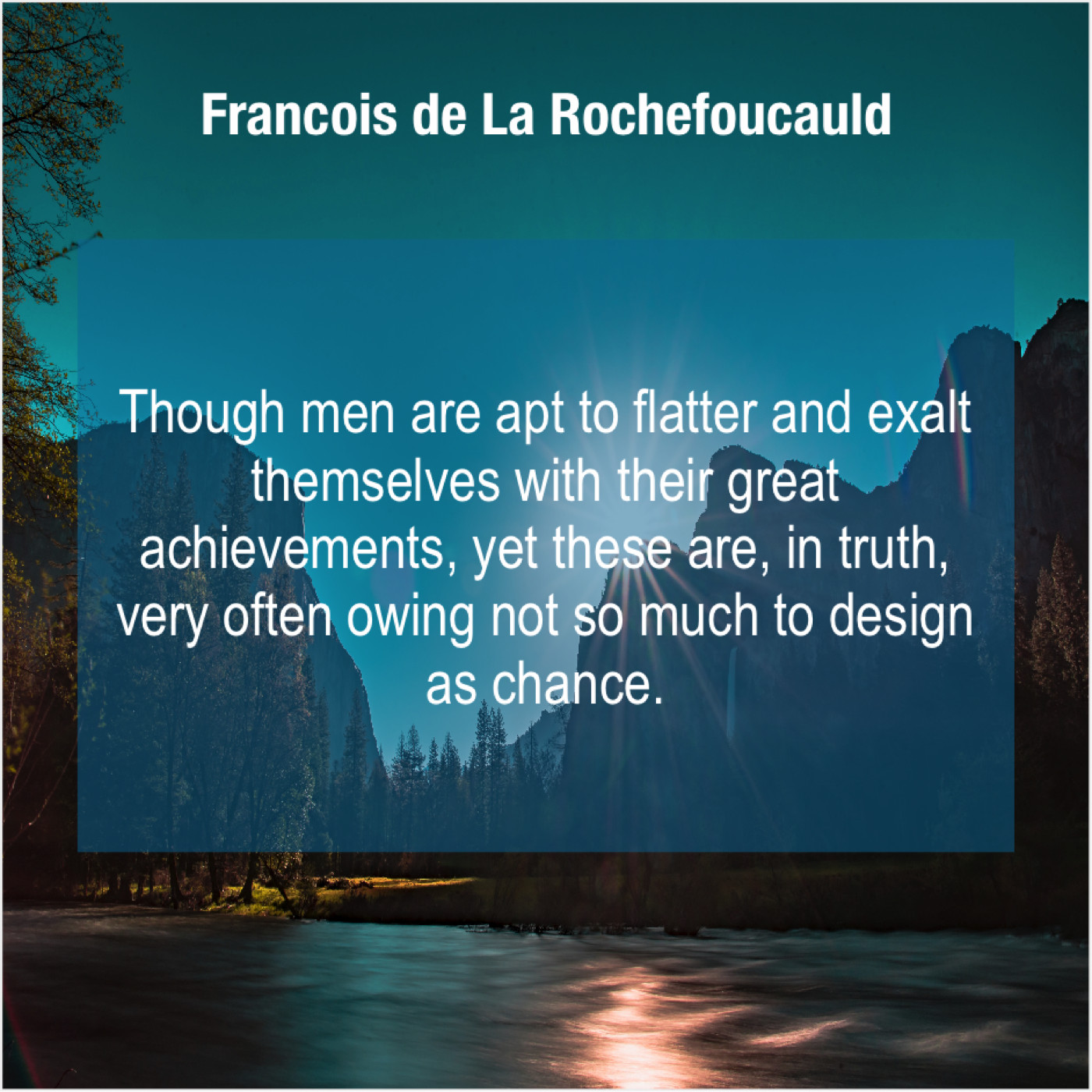 Francois de La Rochefoucauld Francois de La Rochefoucauld – Though men are apt to… October 29, 2018 admin “Though men are apt to flatter and exalt themselves with their great achievements, yet these are, in truth, very often owing not so much to design as chance.”-Francois de La Rochefoucauld