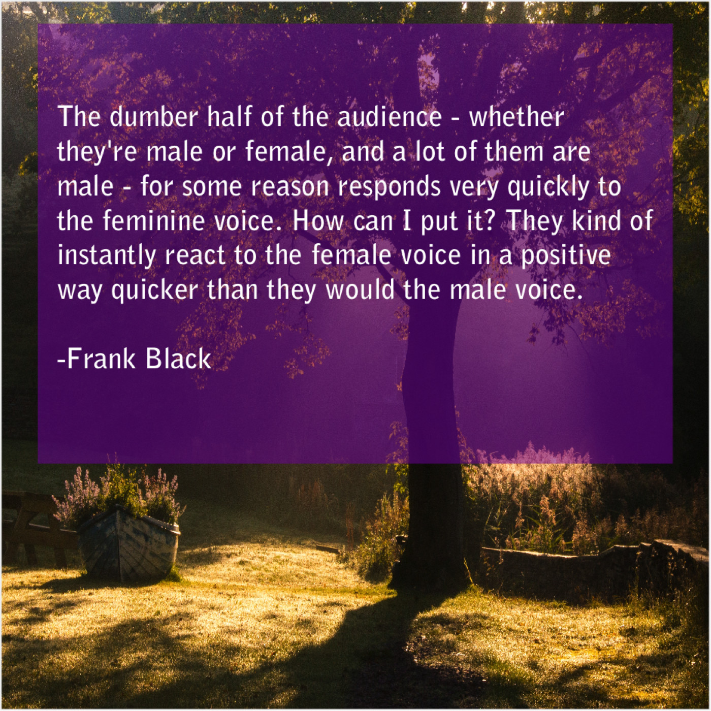 “The dumber half of the audience – whether they’re male or female, and a lot of them are male – for some reason responds very quickly to the feminine voice. How can I put it? They kind of instantly react to the female voice in a positive way quicker than they would the male voice.”