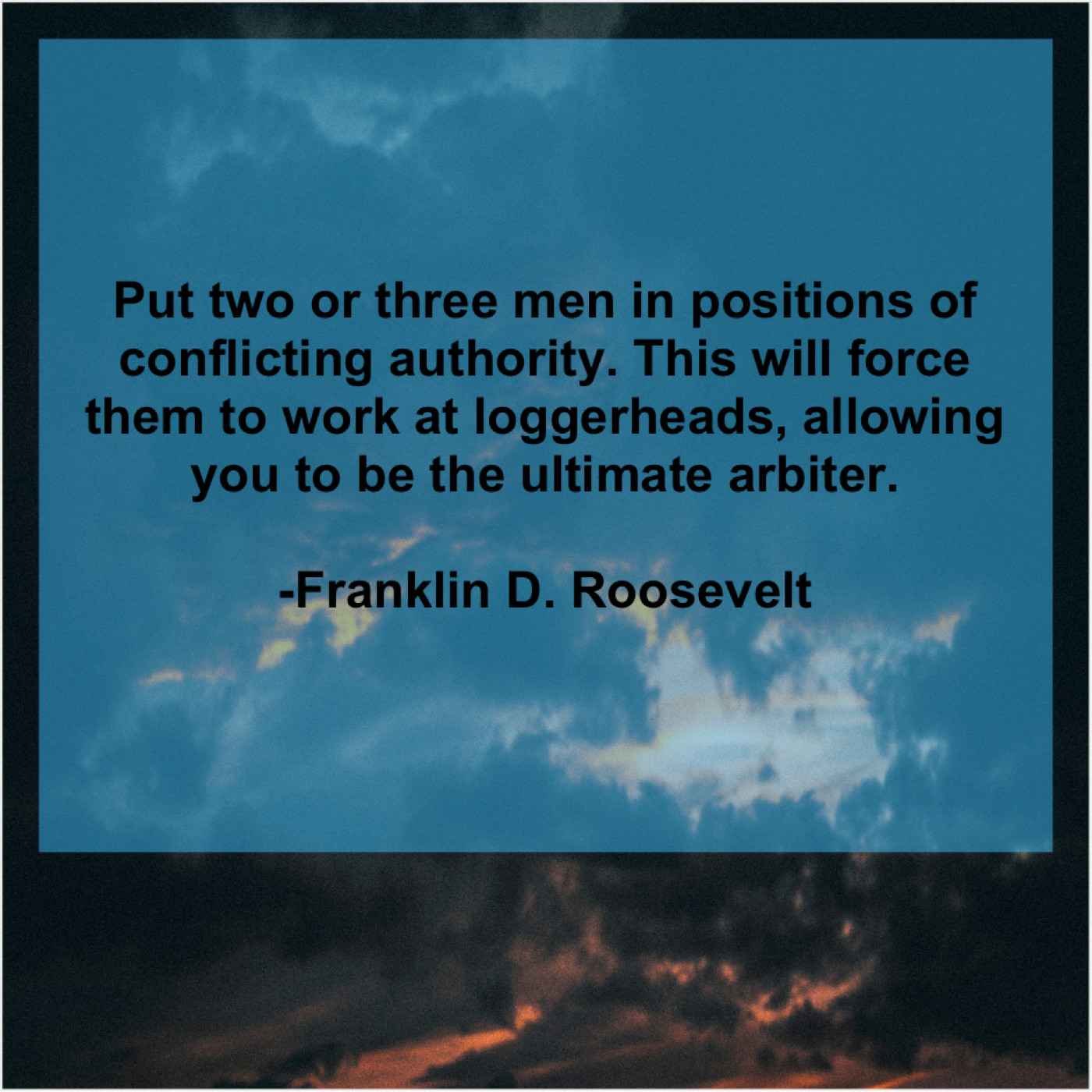 Franklin D. Roosevelt Franklin D. Roosevelt – Put two or three men… November 1, 2018 admin “Put two or three men in positions of conflicting authority. This will force them to work at loggerheads, allowing you to be the ultimate arbiter.”-Franklin D. Roosevelt