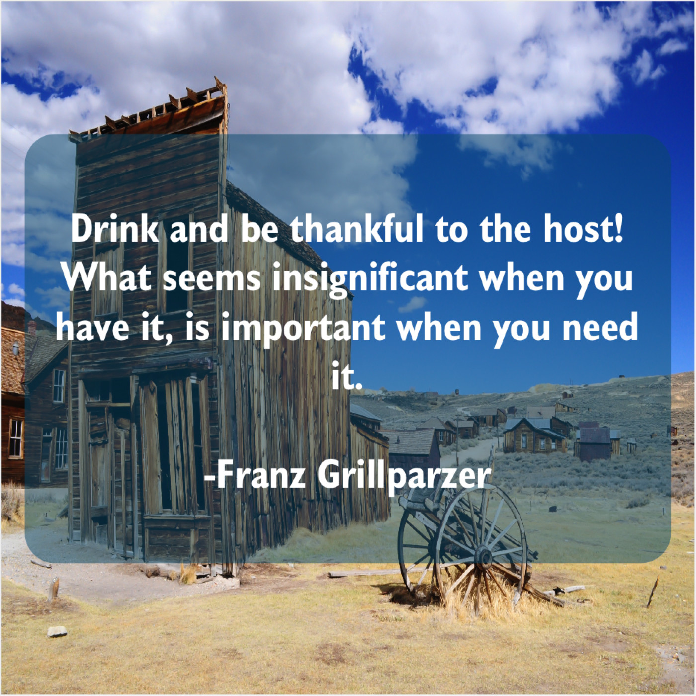 Franz Grillparzer Franz Grillparzer – Drink and be thankful to… July 28, 2019 admin “Drink and be thankful to the host! What seems insignificant when you have it, is important when you need it.”-Franz Grillparzer