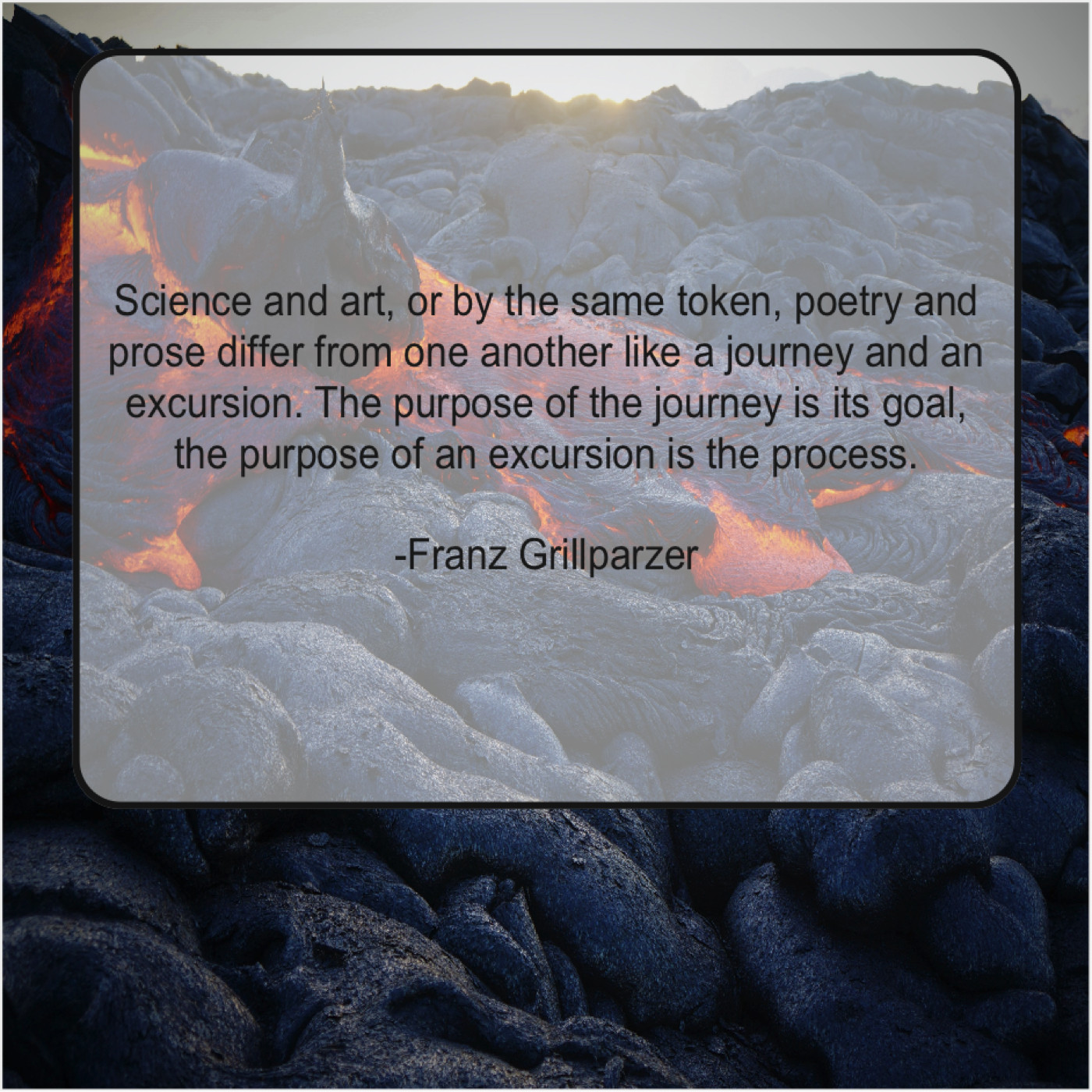 Franz Grillparzer Franz Grillparzer – Science and art, or by… September 9, 2019 admin “Science and art, or by the same token, poetry and prose differ from one another like a journey and an excursion. The purpose of the journey is its goal, the purpose of an excursion is the process.”-Franz Grillparzer