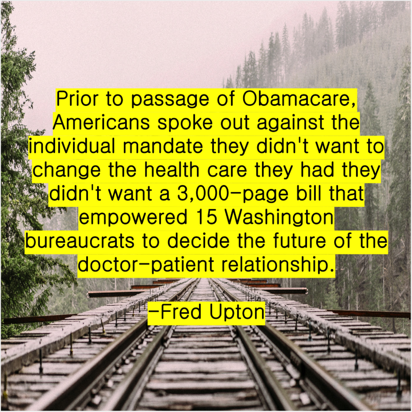 “Prior to passage of Obamacare, Americans spoke out against the individual mandate they didn’t want to change the health care they had they didn’t want a 3,000-page bill that empowered 15 Washington bureaucrats to decide the future of the doctor-patient relationship.”