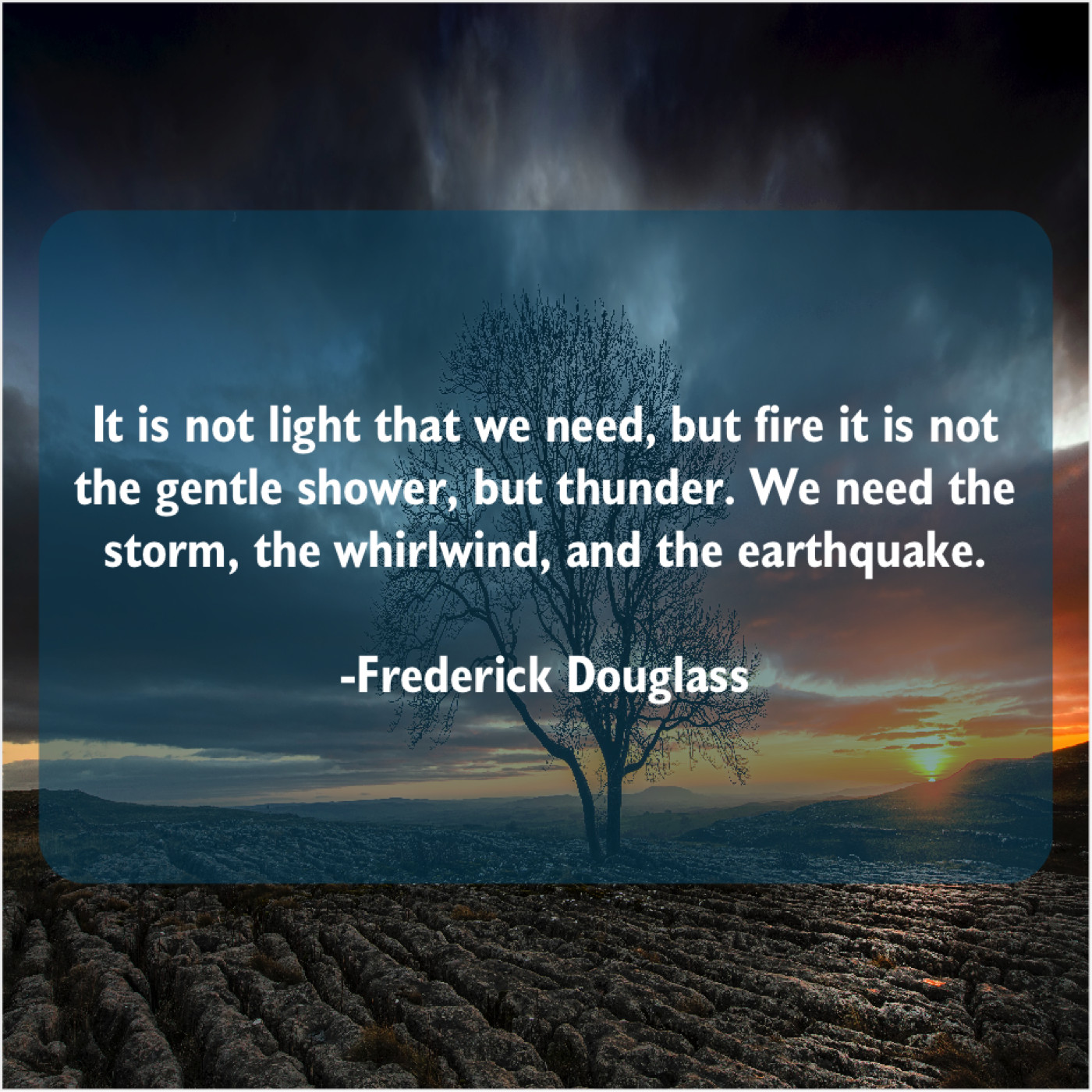 Frederick Douglass Frederick Douglass – It is not light that… April 22, 2019 admin “It is not light that we need, but fire it is not the gentle shower, but thunder. We need the storm, the whirlwind, and the earthquake.”-Frederick Douglass