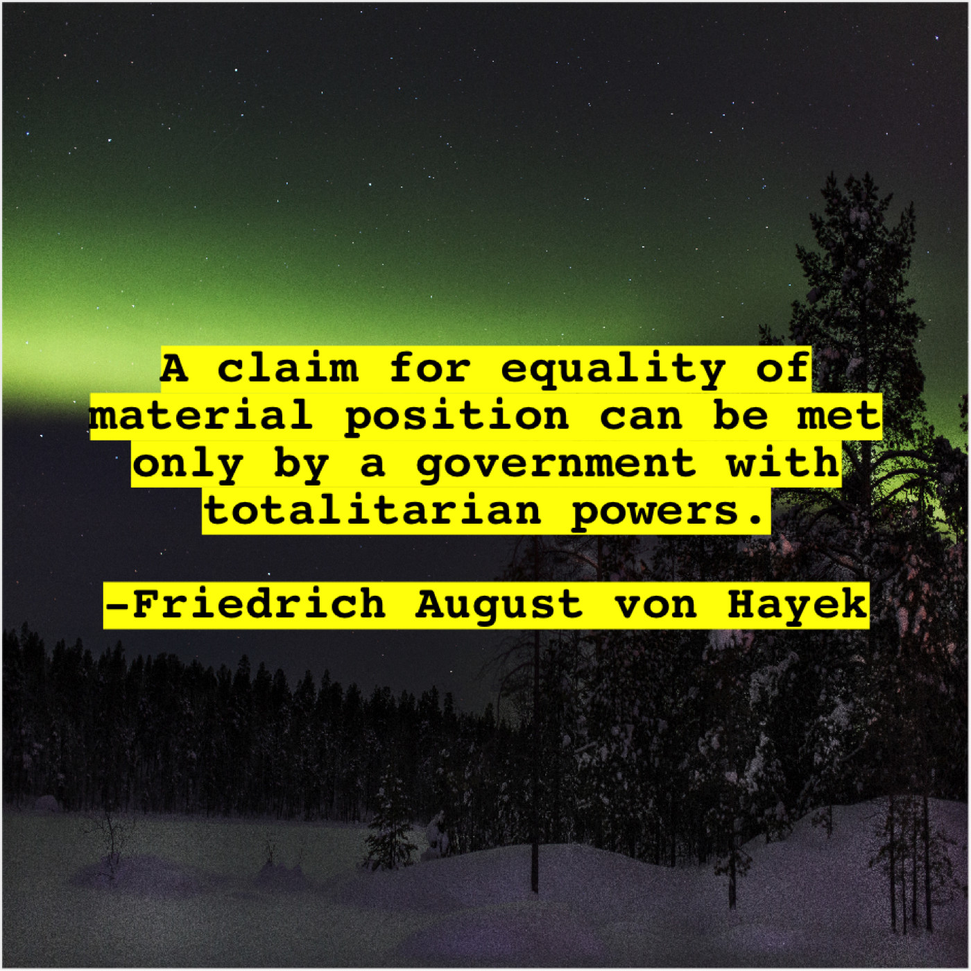 Friedrich August von Hayek Friedrich August von Hayek – A claim for equality of… October 30, 2018 admin “A claim for equality of material position can be met only by a government with totalitarian powers.”-Friedrich August von Hayek