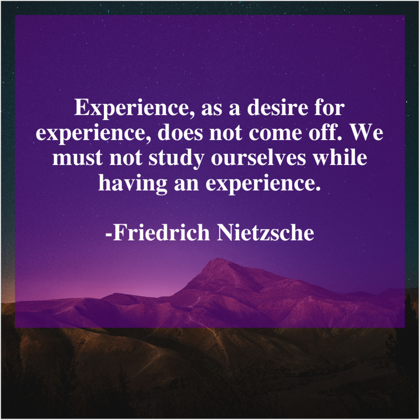 Friedrich Nietzsche Friedrich Nietzsche – Experience, as a desire for… May 13, 2019 admin “Experience, as a desire for experience, does not come off. We must not study ourselves while having an experience.”-Friedrich Nietzsche