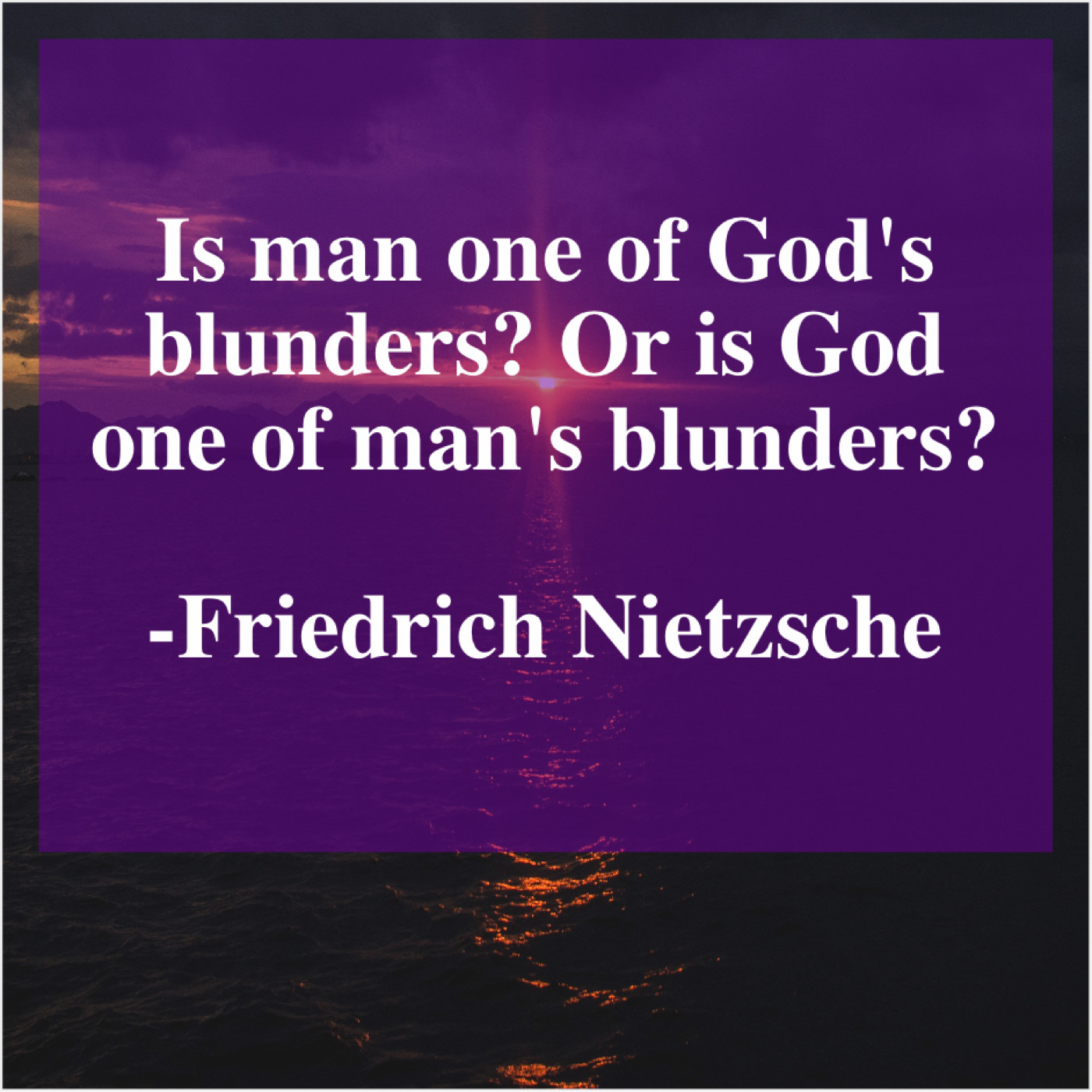 Friedrich Nietzsche Friedrich Nietzsche – Is man one of God’s… April 26, 2019 admin “Is man one of God’s blunders? Or is God one of man’s blunders?”-Friedrich Nietzsche