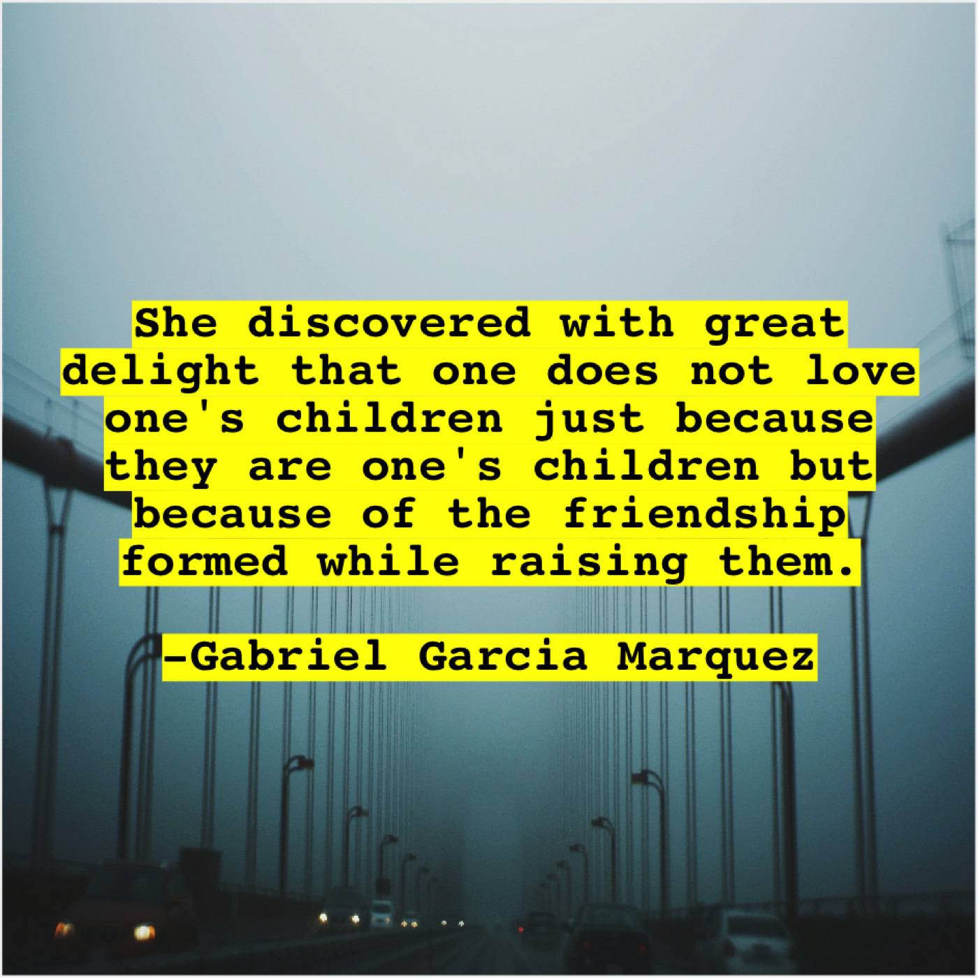 Gabriel Garcia Marquez Gabriel Garcia Marquez – She discovered with great delight… November 12, 2018 admin “She discovered with great delight that one does not love one’s children just because they are one’s children but because of the friendship formed while raising them.”-Gabriel Garcia Marquez