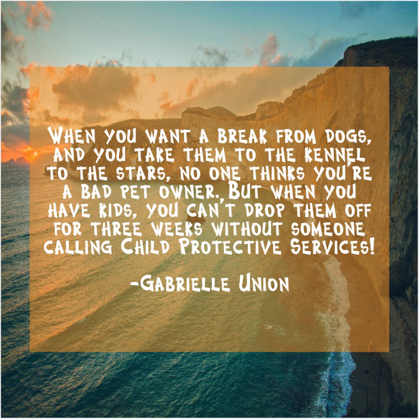 “When you want a break from dogs, and you take them to the kennel to the stars, no one thinks you’re a bad pet owner. But when you have kids, you can’t drop them off for three weeks without someone calling Child Protective Services!” -Gabrielle Union