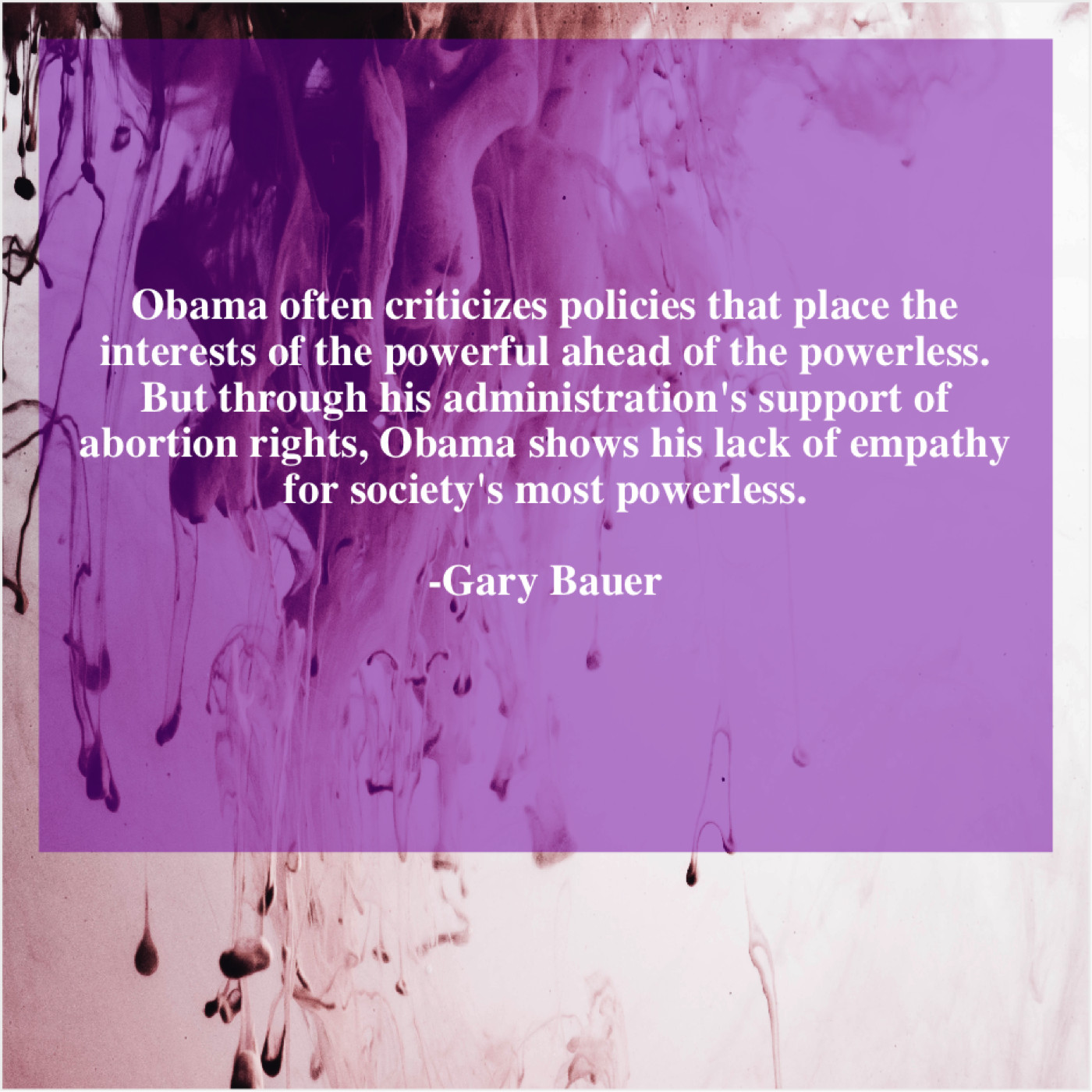 Gary Bauer Gary Bauer – Obama often criticizes policies that… May 28, 2019 admin “Obama often criticizes policies that place the interests of the powerful ahead of the powerless. But through his administration’s support of abortion rights, Obama shows his lack of empathy for society’s most powerless.”-Gary Bauer