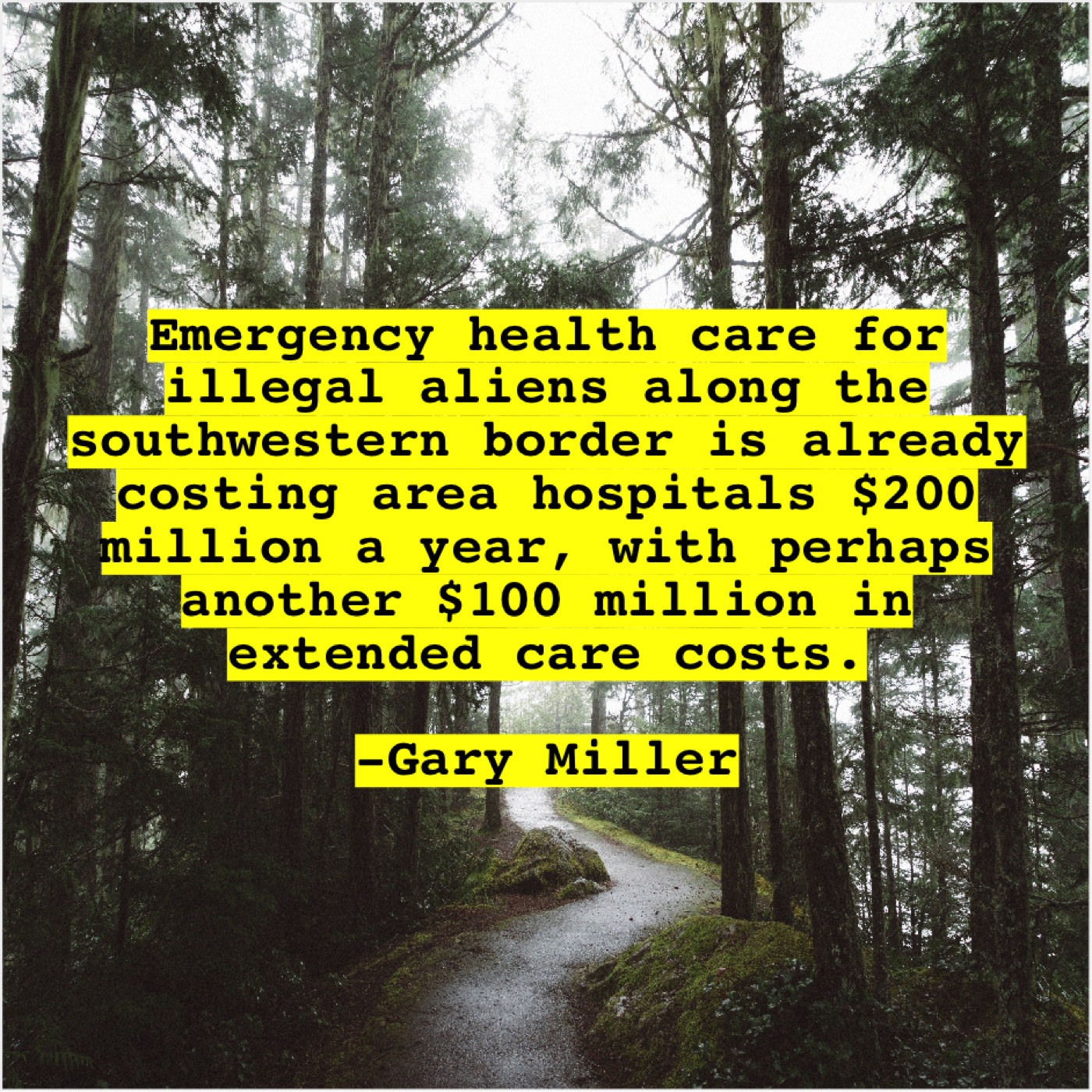 Gary Miller Gary Miller – Emergency health care for illegal… May 26, 2019 admin “Emergency health care for illegal aliens along the southwestern border is already costing area hospitals $200 million a year, with perhaps another $100 million in extended care costs.”-Gary Miller